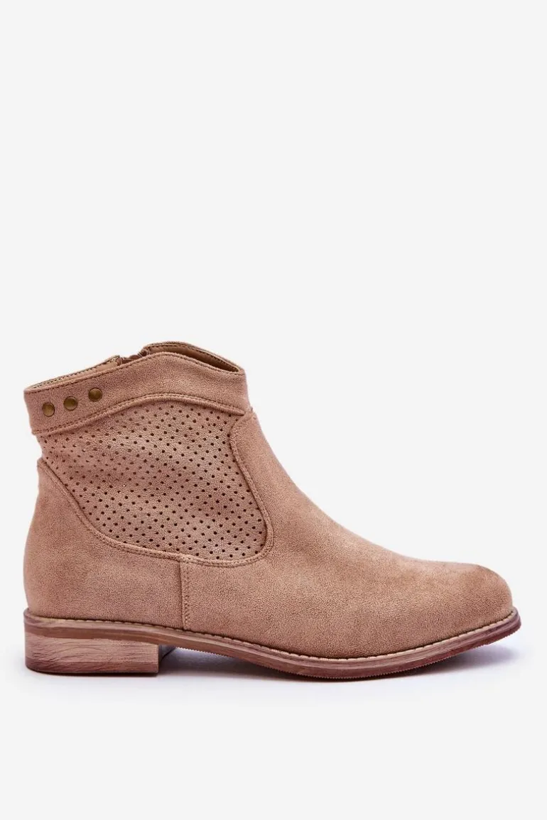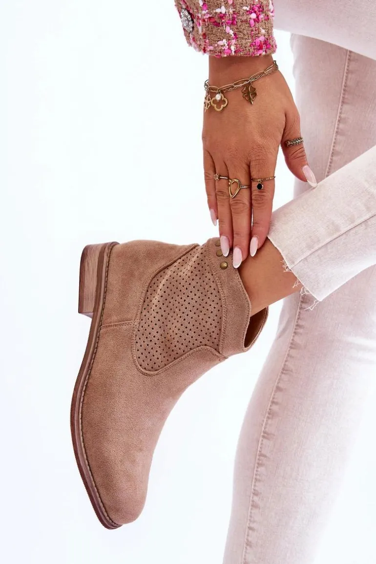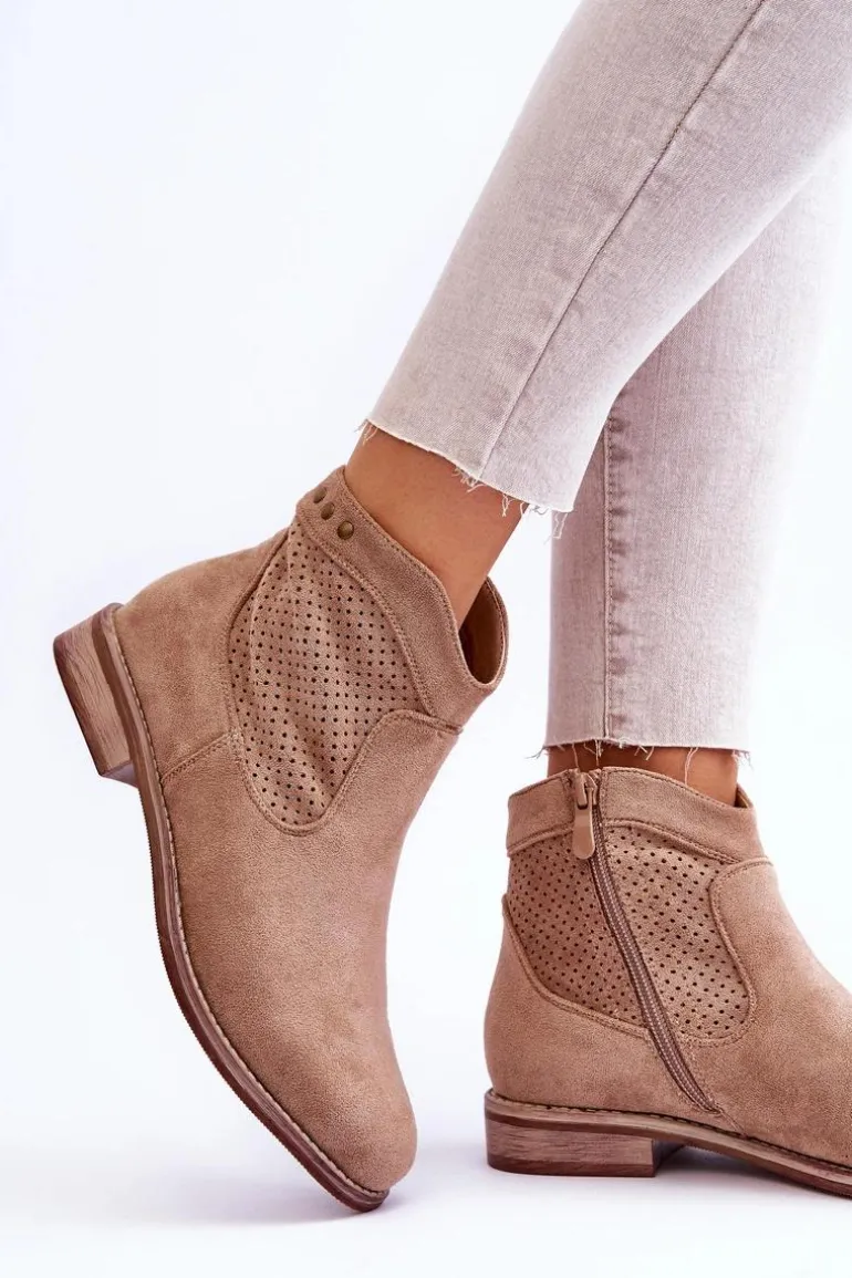 Klasyczne botki wykonane z miłego w dotyku eko zamszu z ażurową cholewką. Posiadają ozdobne elementy w postaci ćwieków. Osadzone na płaskim obcasie. Dodatkowo botki posiadają usztywniany zapiętek. Z boku cholewki znajduje się suwak ułatwiający zakładanie obuwia. Koniecznie sprawdź także pozostałe modele botków dostępnych w naszej ofercie! Przy wyborze rozmiaru prosimy sugerować się tabelą rozmiarów.