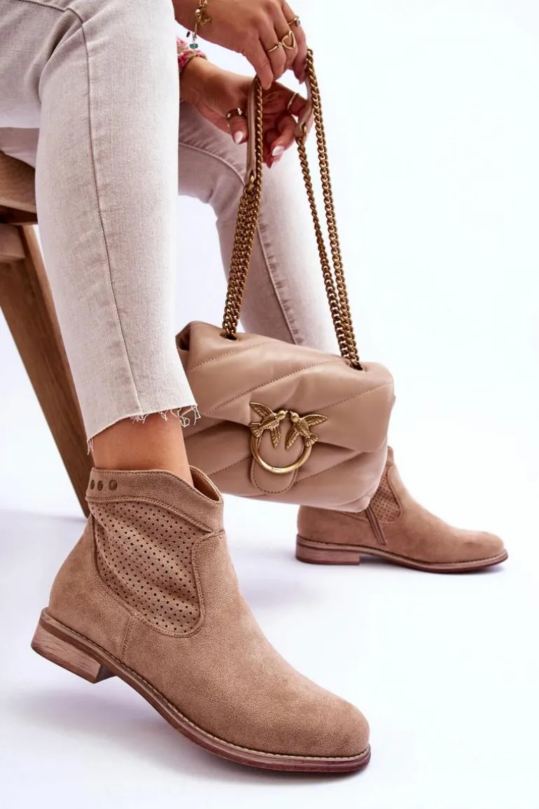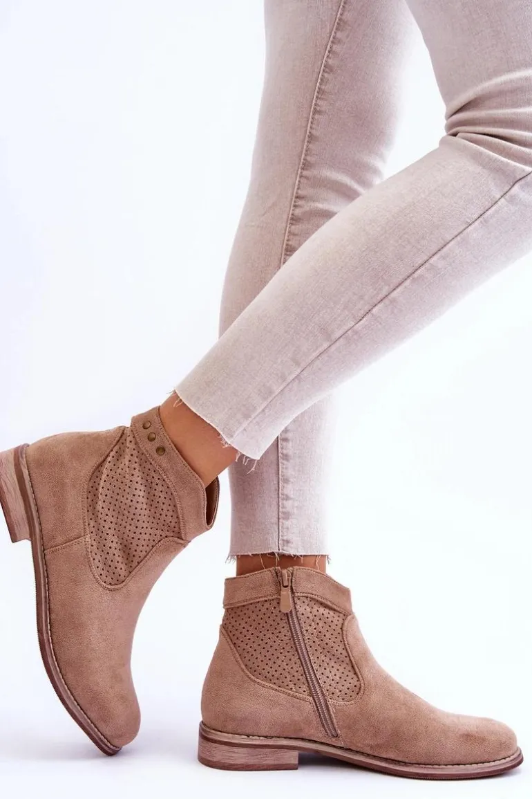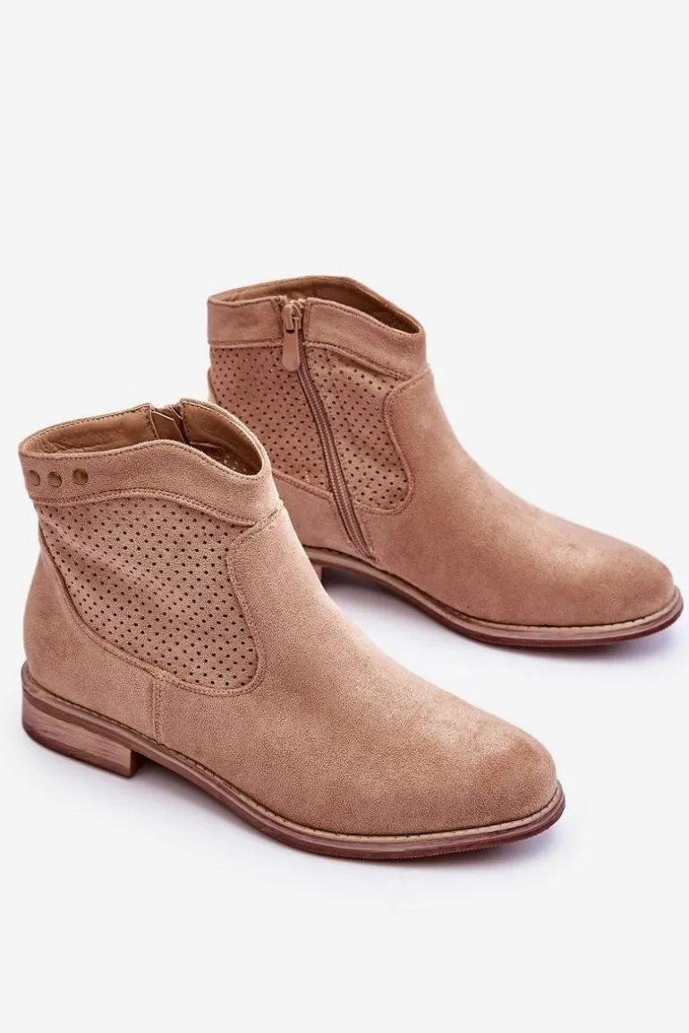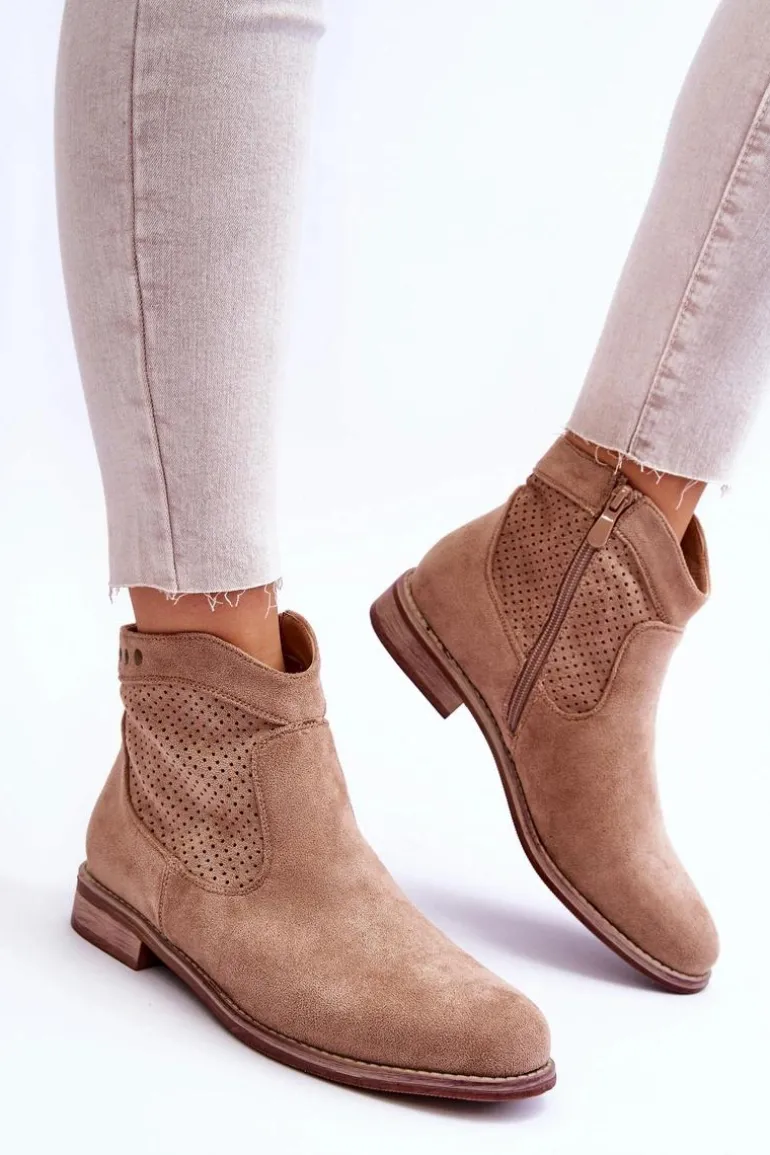 Klasyczne botki wykonane z miłego w dotyku eko zamszu z ażurową cholewką. Posiadają ozdobne elementy w postaci ćwieków. Osadzone na płaskim obcasie. Dodatkowo botki posiadają usztywniany zapiętek. Z boku cholewki znajduje się suwak ułatwiający zakładanie obuwia. Koniecznie sprawdź także pozostałe modele botków dostępnych w naszej ofercie! Przy wyborze rozmiaru prosimy sugerować się tabelą rozmiarów.