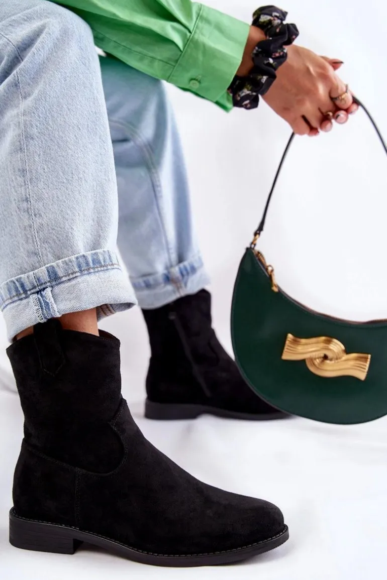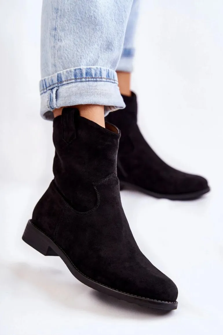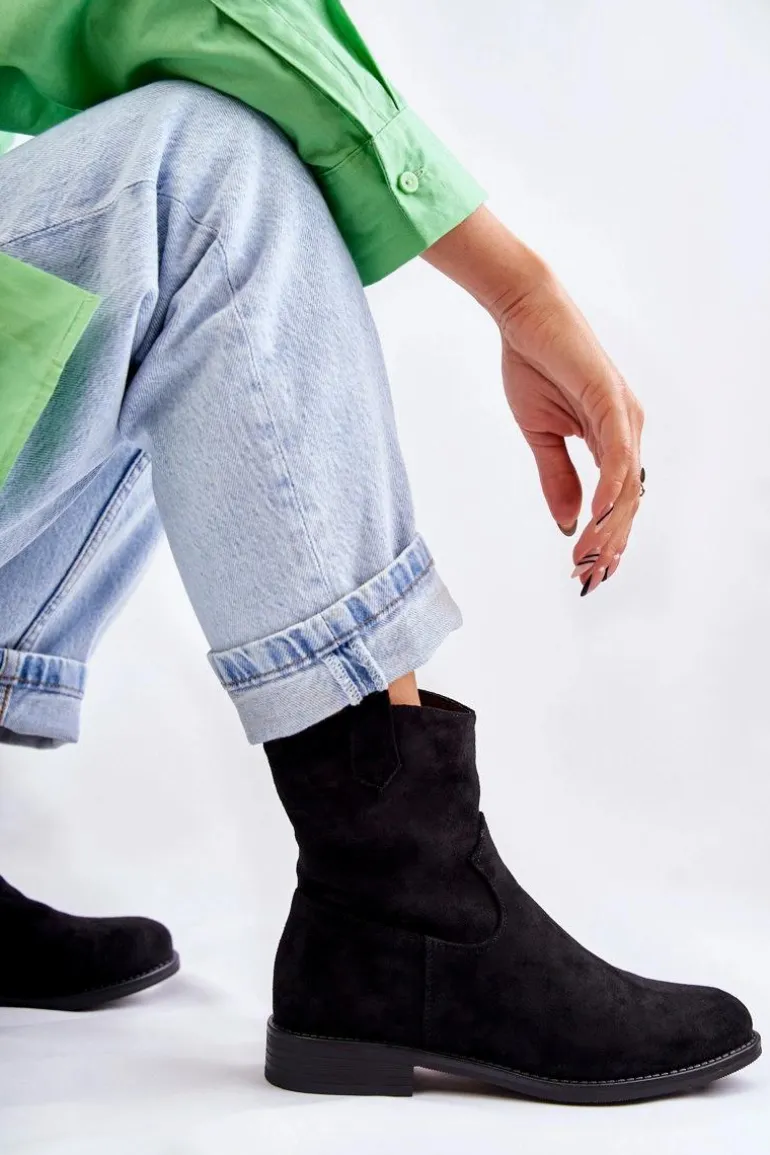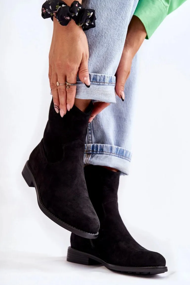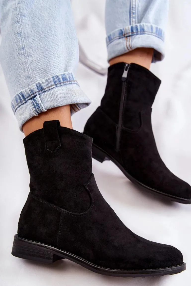 Klasyczne botki damskie zostały wykonane z miłego w dotyku eko zamszu. Na cholewce znajdują się delikatne przeszycia. Model ten posiada pętelkę ułatwiającą zakładanie obuwia po zewnętrznej stronie. Botki posiadają także suwak. Osadzone na płaskim obcasie. Posiadają usztywniany zapiętek oraz eko skórzaną wkładkę. Przy wyborze rozmiaru prosimy sugerować się tabelą rozmiarów.