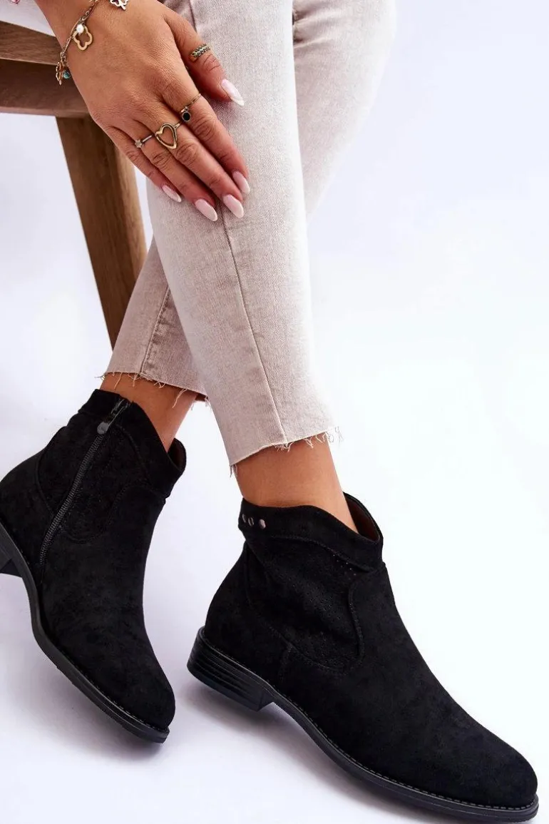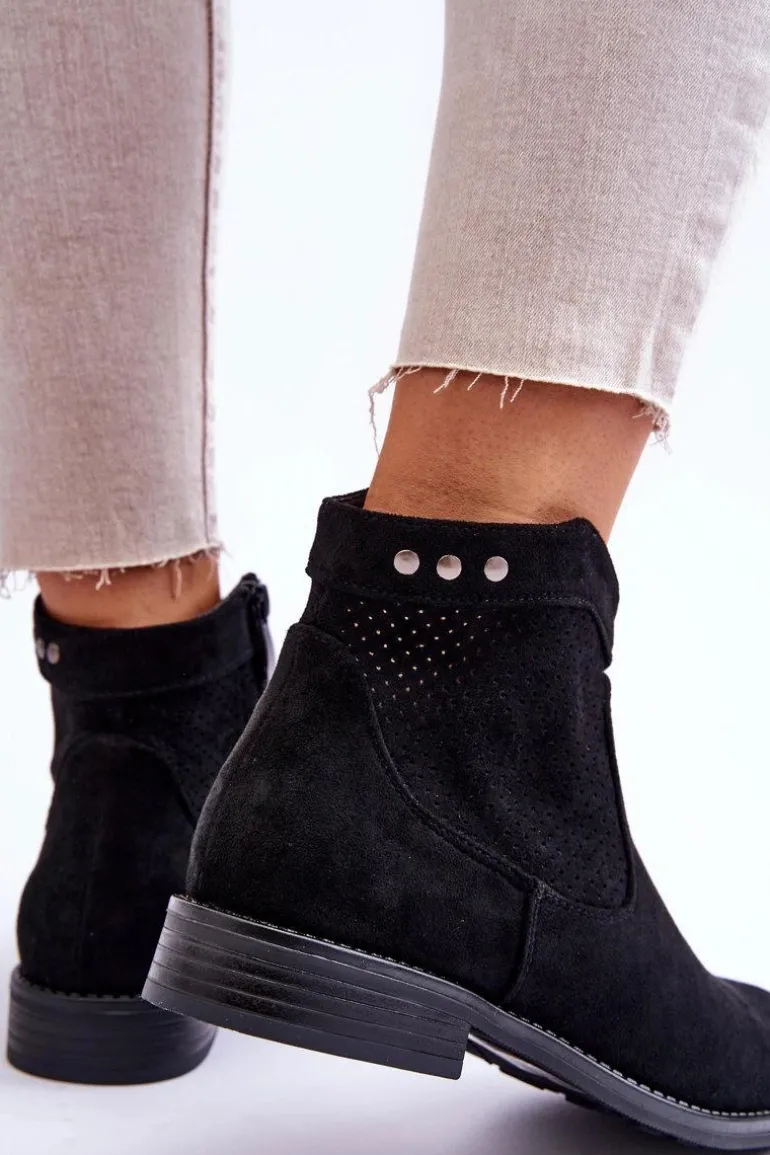 Klasyczne botki wykonane z miłego w dotyku eko zamszu z ażurową cholewką. Posiadają ozdobne elementy w postaci ćwieków. Osadzone na płaskim obcasie. Dodatkowo botki posiadają usztywniany zapiętek. Z boku cholewki znajduje się suwak ułatwiający zakładanie obuwia. Koniecznie sprawdź także pozostałe modele botków dostępnych w naszej ofercie! Przy wyborze rozmiaru prosimy sugerować się tabelą rozmiarów.