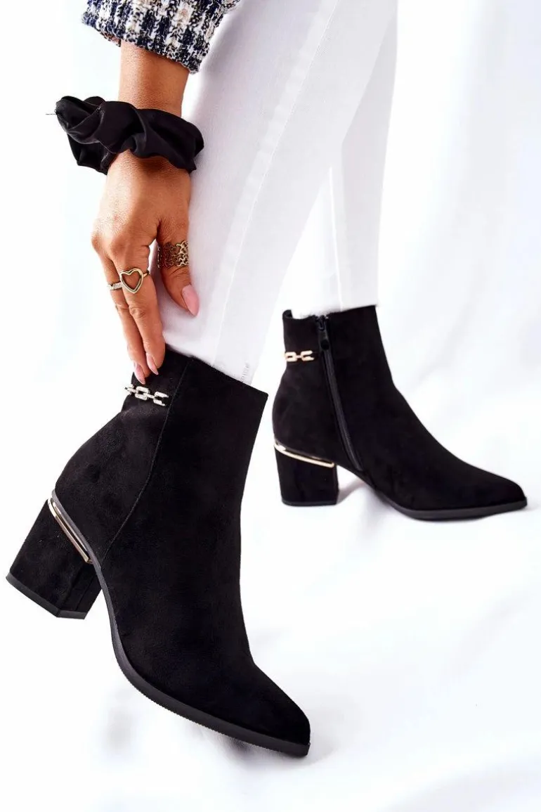 Botki wykonane z wysokiej jakości zamszowej skóry ekologicznej. Wnętrze pokryte ciepłym kocem obuwniczym. Fason o migdałowym nosku, połączony ze złotym zdobieniem na słupku oraz pięknym łańcuszkiem na cholewce – są po prostu cudowne! Zakładanie ułatwi wszyty na boku suwak. Przy wyborze rozmiaru prosimy sugerować się tabelą rozmiarów.