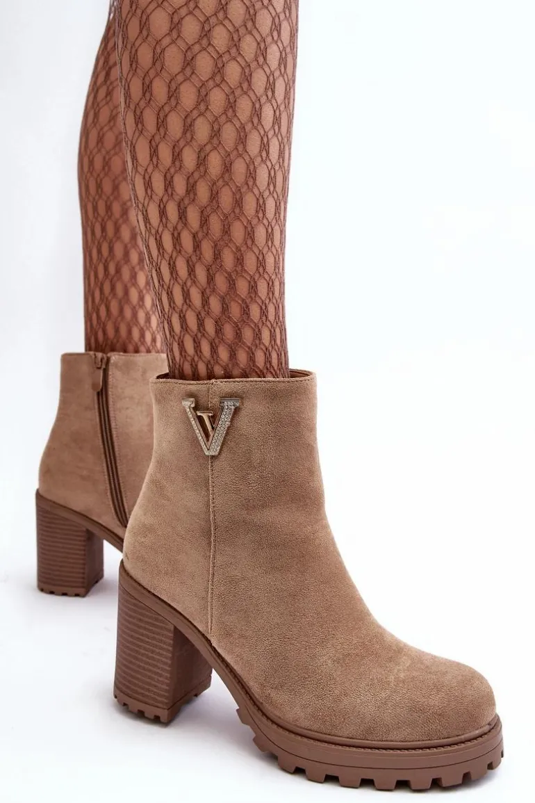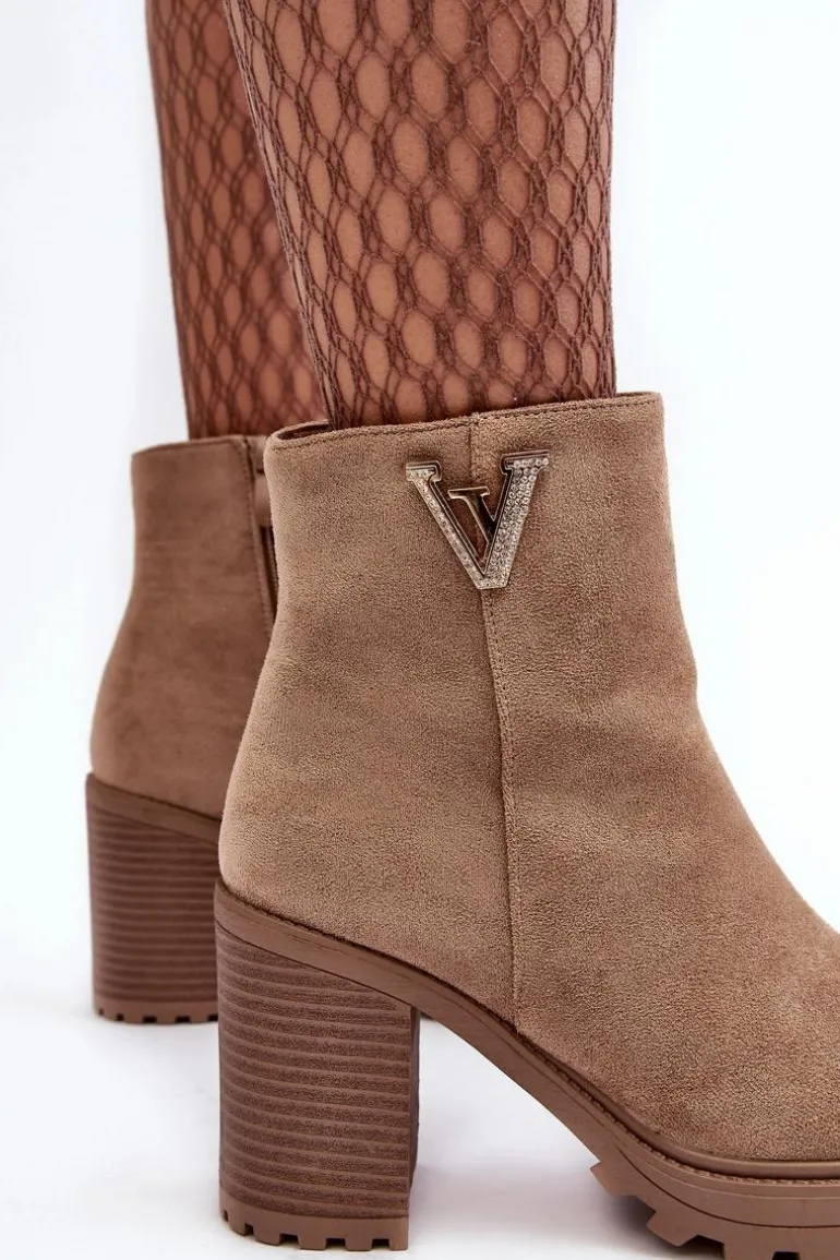 Botki damskie osadzone na obcasie w postaci słupka oraz platformie. Zostały wykonane z eko zamszu. Na cholewce z boku umieszczono ozdobę w postaci litery z dżetami. Środek nie jest ocieplony. Usztywniony zapiętek zapewni stabilizację. Model ten będzie idealnym uzupełnieniem jesienno-zimowych stylizacji! Przy wyborze rozmiaru prosimy sugerować się tabelą rozmiarów.