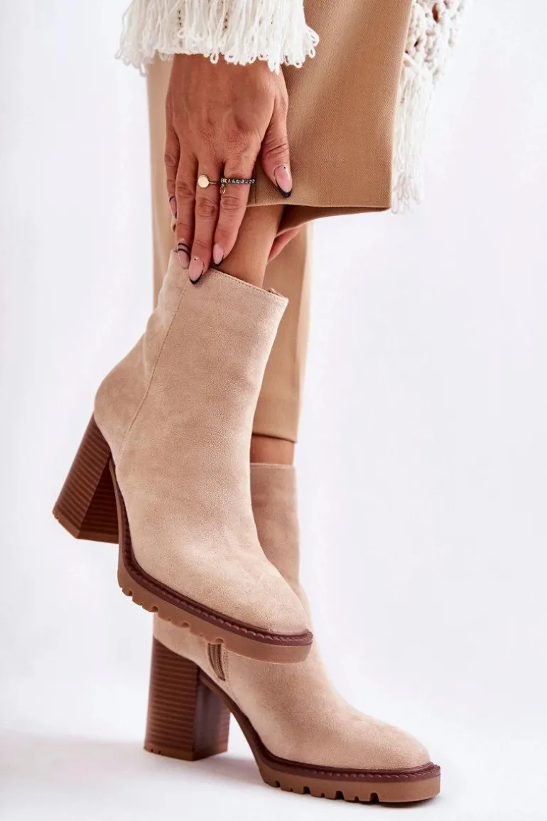 Świetne botki wykonane z miłego w dotyku eko zamszu. Model osadzony na delikatnej platformie i obcasie w postaci słupka. Buty te posiadają lekko kwadratowy nosek oraz usztywniany zapiętek. Cholewka za kostkę posiada suwak ułatwiający zakładanie obuwia. Model wygodny i stabilny. Świetnie będą komponować się plisowanymi spódnicami. Przy wyborze rozmiaru prosimy sugerować się tabelą rozmiarów.