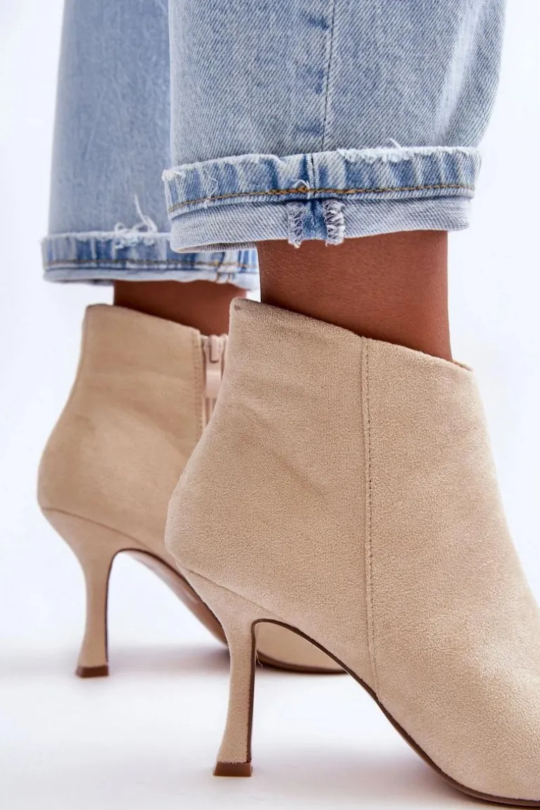 Eleganckie botki damskie zostały wykonane z eko zamszu. Model osadzony na obcasie w postaci szpilki, z noskiem w szpic świetnie wysmukli nogi. Botki są zapinane z boku na suwak. Zapiętek w tych botkach jest usztywniany. Model ten świetnie sprawdzi się w wielu stylizacjach np.: do sukienek, spódnic czy spodni. Te botki koniecznie powinny znaleźć się w Twojej szafie! Przy wyborze rozmiaru prosimy sugerować się tabelą rozmiarów.