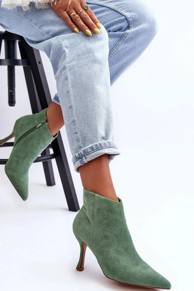 Eleganckie botki damskie zostały wykonane z eko zamszu. Model osadzony na obcasie w postaci szpilki, z noskiem w szpic świetnie wysmukli nogi. Botki są zapinane z boku na suwak. Zapiętek w tych botkach jest usztywniany. Model ten świetnie sprawdzi się w wielu stylizacjach np.: do sukienek, spódnic czy spodni. Te botki koniecznie powinny znaleźć się w Twojej szafie! Przy wyborze rozmiaru prosimy sugerować się tabelą rozmiarów.