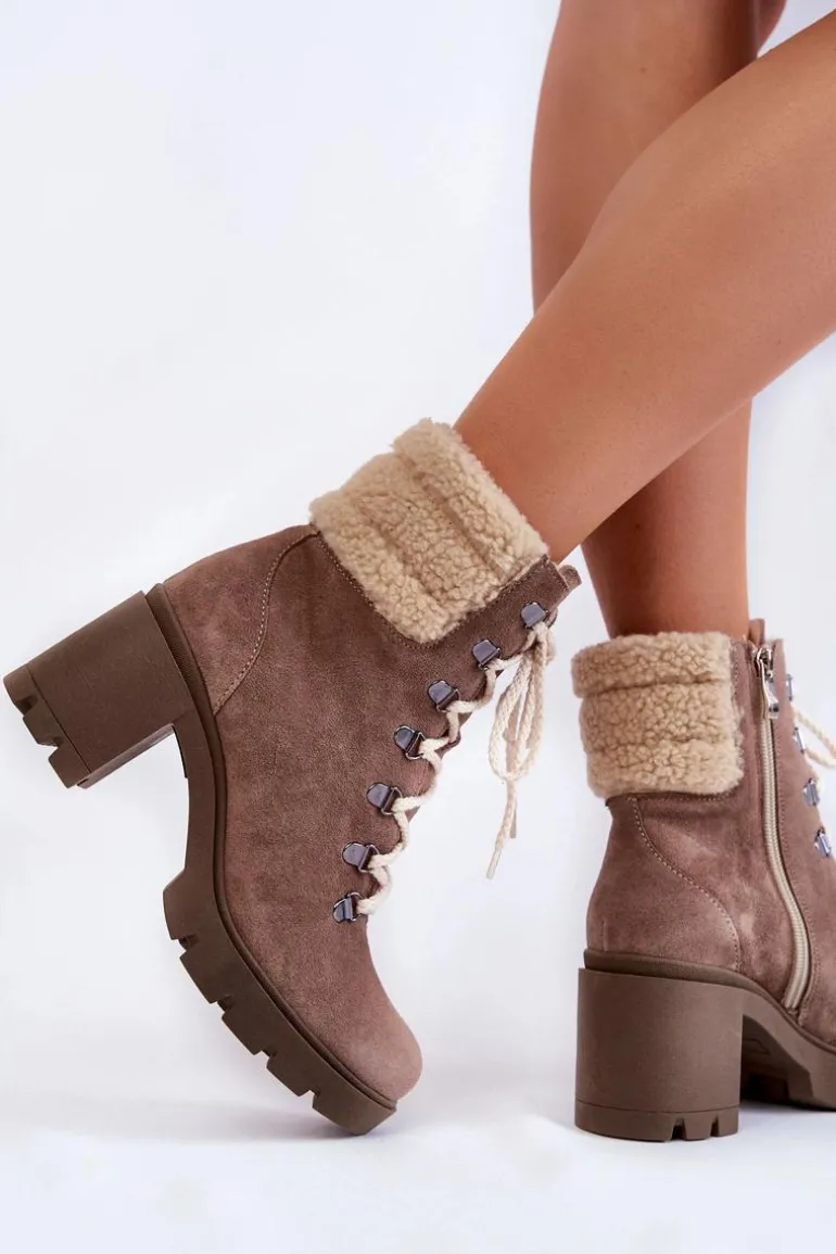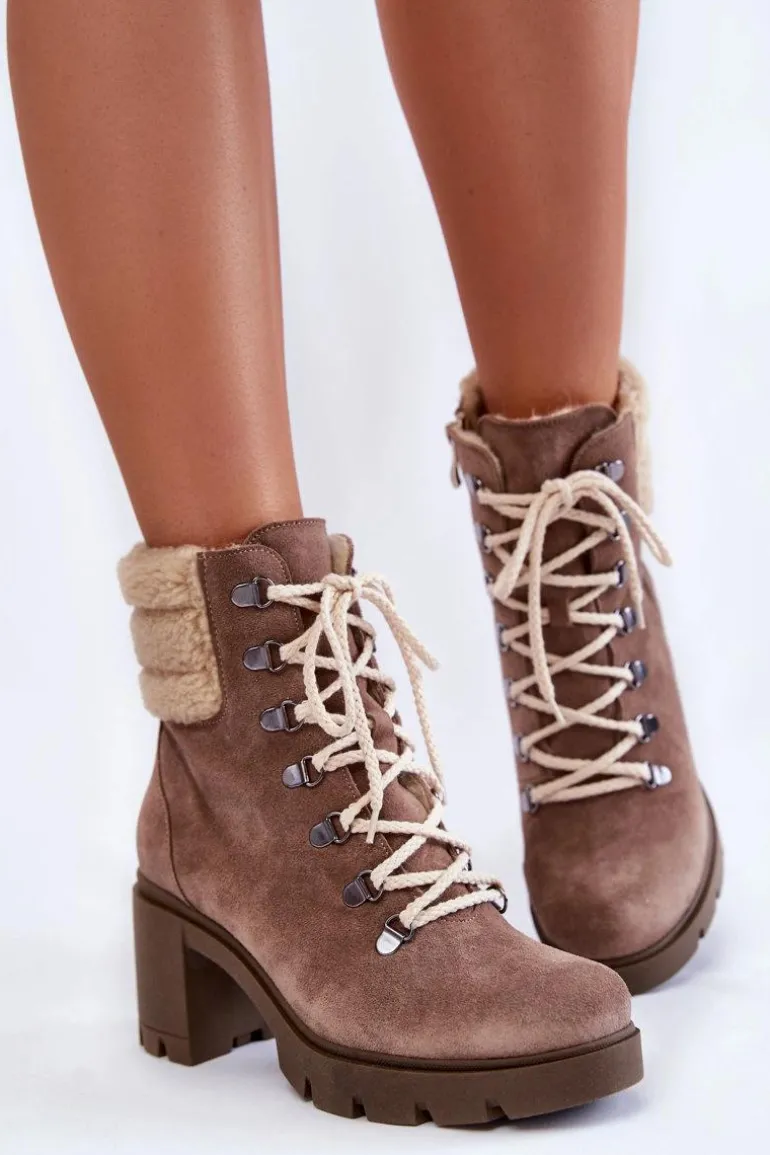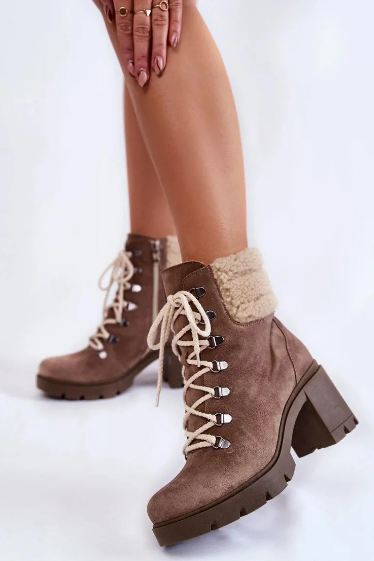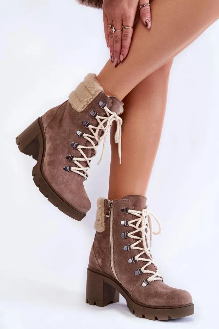 Wyjątkowe, damskie botki zostały wykonane z wysokiej jakości naturalnych skór. Model posiada ocieplenie w postaci naturalnej wełny. Dodatkowo botki zostały przyozdobione kożuszkiem z zewnątrz. Zapiętek jest usztywniany. Model ten posiada sznurowanie oraz suwak z boku cholewki. Osadzone na masywnym obcasie w postaci słupka oraz platformie ze żłobieniami. Przy wyborze rozmiaru prosimy kierować się tabelą rozmiarów