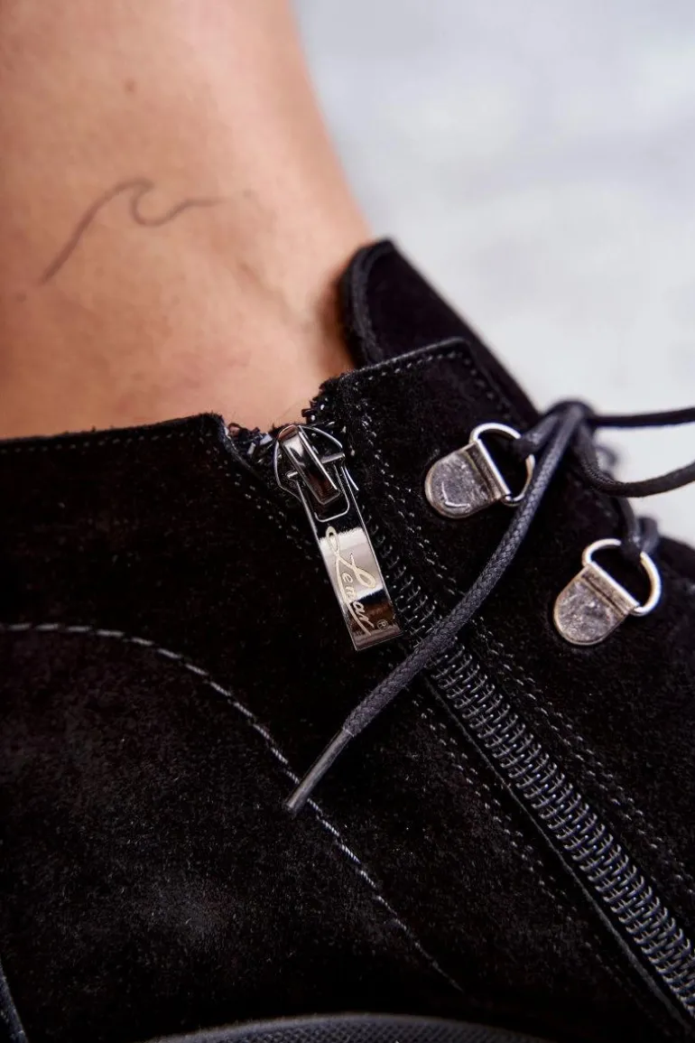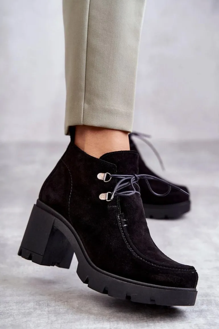 Botki o fasonie trzewików posiadające cholewkę sięgającą powyżej kostki. Gruby, stabilny obcas oraz okrągły nosek. Wiązane na cienkie, okrągłe sznurówki w dopasowanym do obuwia kolorze. Wykonane ze skóry naturalnej. Całość tworzy niebanalny charakter. Botki są ocieplane, z usztywnianym zapiętkiem. Posiadają suwak z boku cholewki ułatwiający zakładanie obuwia. Idealne do wielu stylizacji! Przy wyborze rozmiaru prosimy sugerować się tabelą rozmiarów.