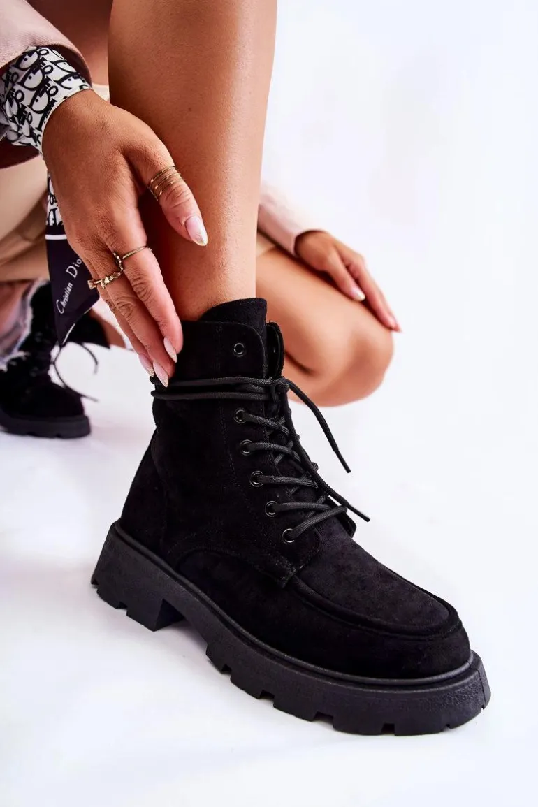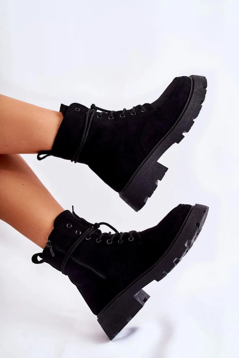 Klasyczne botki z cholewką za kostkę zostały wykonane z przyjemnego w dotyku eko zamszu. Model ten posiada z boku cholewki suwak. Dodatkowo są sznurowane, co pozwoli na odpowiednie dopasowanie obuwia do tęgości nogi. Osadzone na delikatnej platformie oraz płaskim obcasie. Posiadają w środku ocieplenie w postaci miłego w dotyku futerka. Zapiętek delikatnie usztywniany. Przy wyborze rozmiaru prosimy sugerować się tabelą rozmiarów.