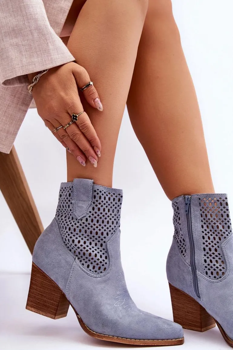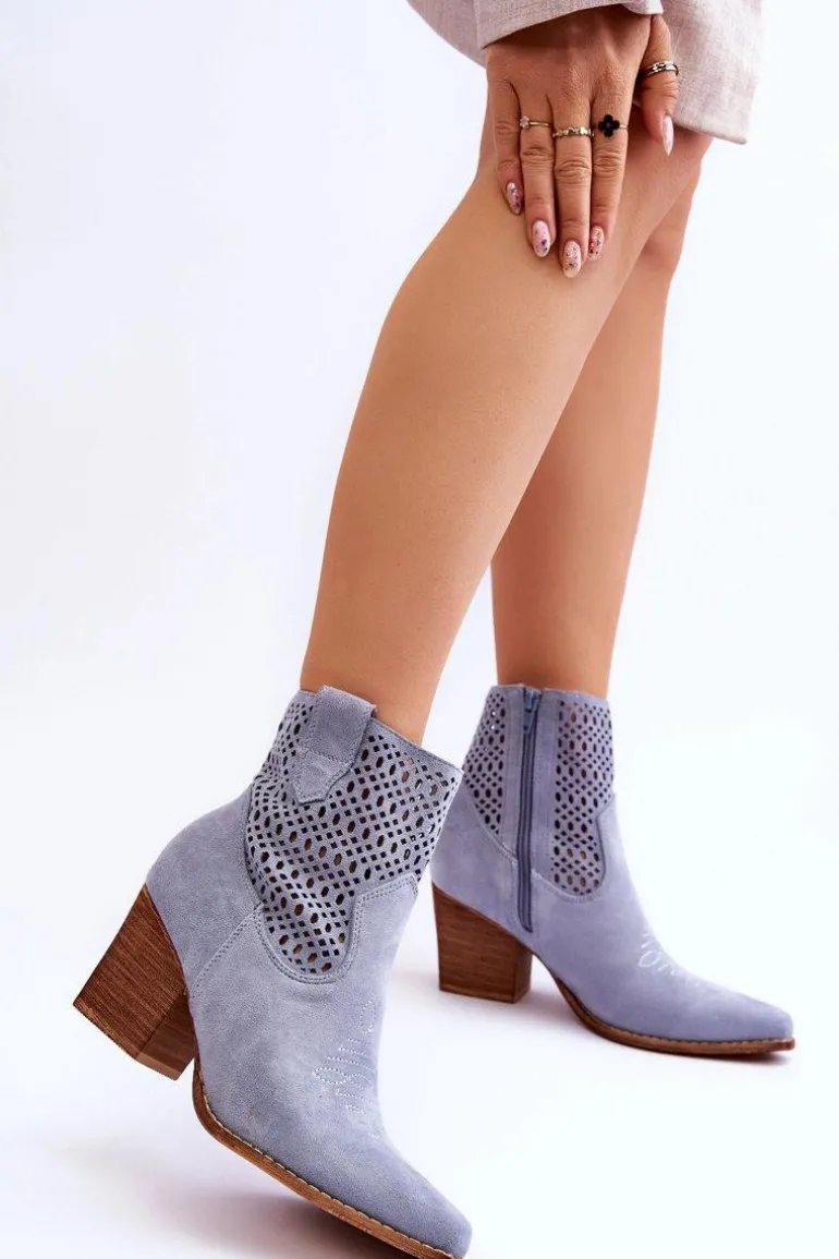 Wyjątkowe botki w stylu kowbojskim z cholewką za kostkę. Botki wykonane zostały z ekologicznego zamszu z ażurowym wzorem i przeszyciem na przodzie. Materiałowa wkładka oraz stabilny obcas w postaci słupka zadbają o Twój komfort. Botki z pewnością dopełnią wiele Twoich stylizacji. Koniecznie sprawdź całą naszą kolekcję kowbojek! Przy wyborze rozmiaru prosimy sugerować się tabelą rozmiarów.