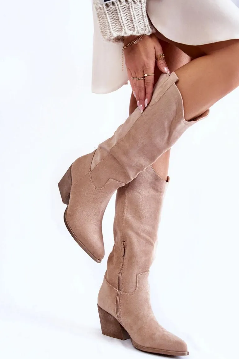 Modne kozaki-kowbojki uzupełnią wiele Twoich jesiennych stylizacji! Model wykonany z miłego eko zamszu. Kozaki są wsuwane, a także posiadają zamek z boku cholewki. Osadzone na obcasie w postaci masywnego słupka. Ocieplone wewnątrz kocem obuwniczym. Nosek w szpic optycznie wysmukli nogi. Kozaki posiadają usztywniany zapiętek. Przy wyborze rozmiaru prosimy sugerować się tabelą rozmiarów.