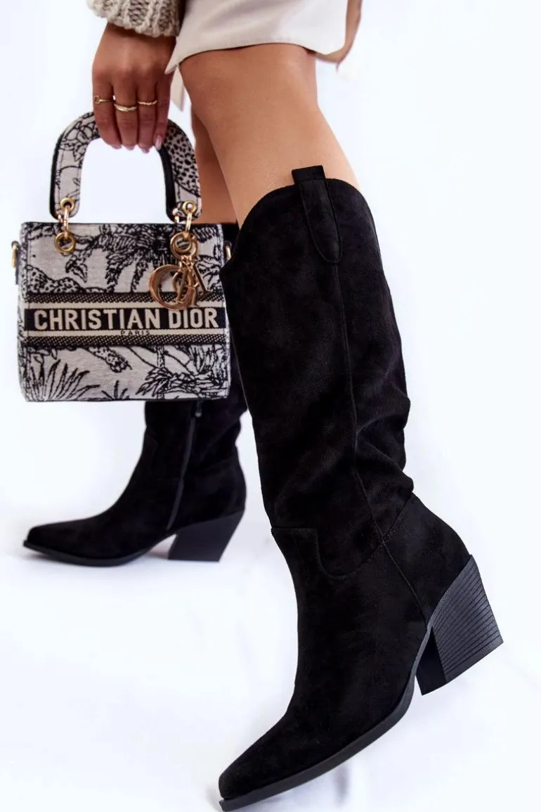 Modne kozaki-kowbojki uzupełnią wiele Twoich jesiennych stylizacji! Model wykonany z miłego eko zamszu. Kozaki są wsuwane, a także posiadają zamek z boku cholewki. Osadzone na obcasie w postaci masywnego słupka. Ocieplone wewnątrz kocem obuwniczym. Nosek w szpic optycznie wysmukli nogi. Kozaki posiadają usztywniany zapiętek. Przy wyborze rozmiaru prosimy sugerować się tabelą rozmiarów.