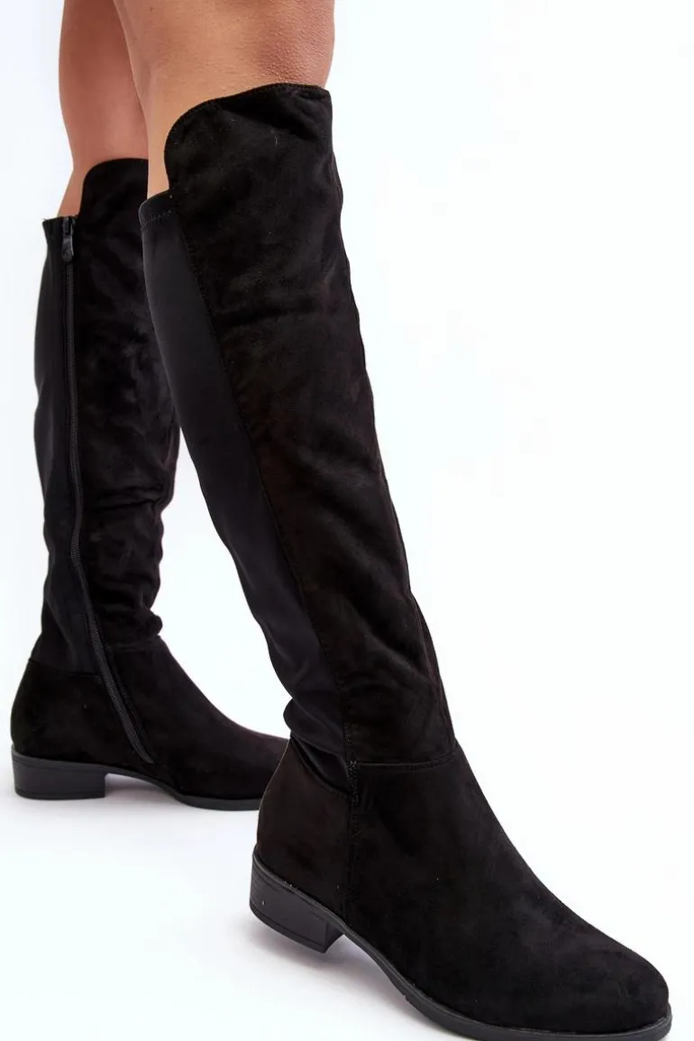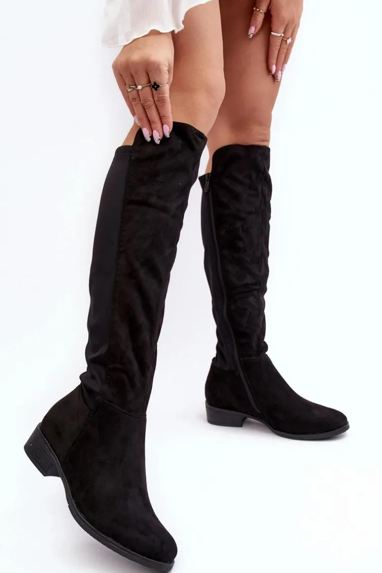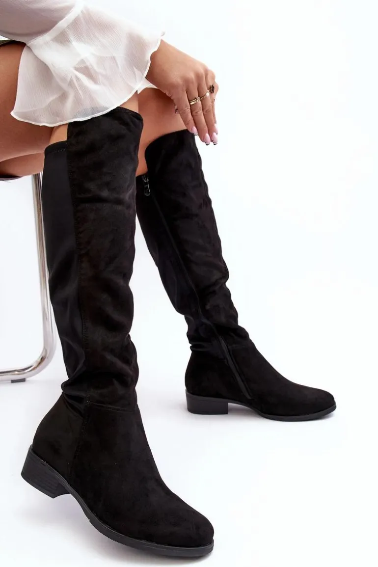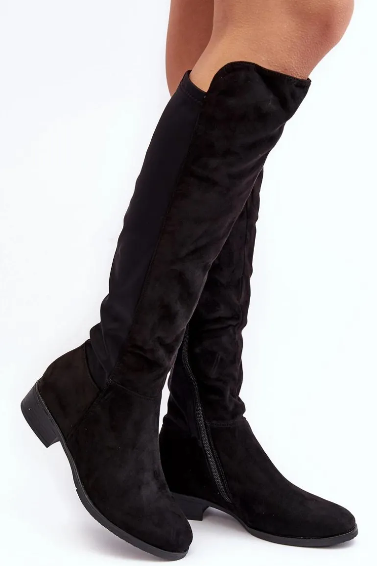 Damskie kozaki wykonane z połączenia eko zamszu i materiału tekstylnego. Osadzone na płaskim obcasie. Noski zaokrąglone. Środek częściowo ocieplony kocem obuwniczym. Dodatkowo kozaki posiadają usztywniony zapiętek. Cholewka przed kolano. Z pewnością wykorzystasz je do wielu stylizacji. Przy wyborze rozmiaru prosimy sugerować się tabelą rozmiarów.