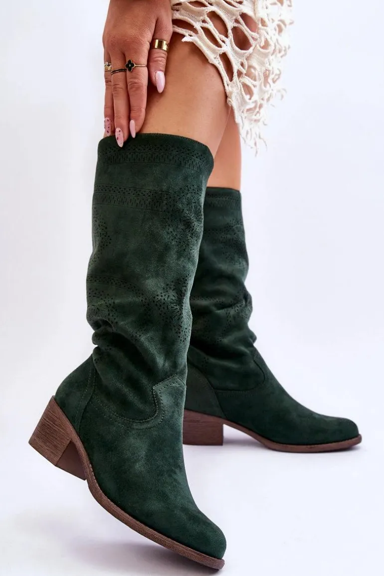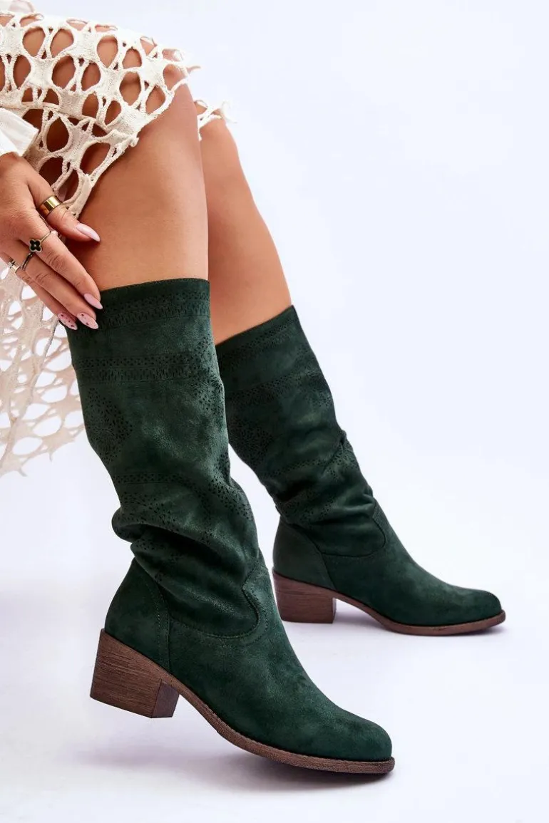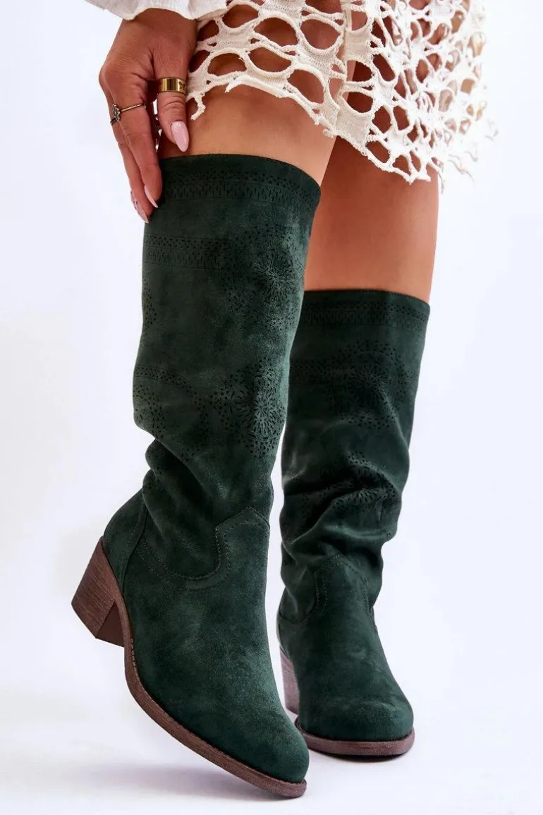 Piękne, damskie kozaki przed kolano zostały ozdobione ażurowym wzorem. Cholewka wykonana z miłego w dotyku eko zamszu. Zapiętek w tych butach jest usztywniany. Kozaki posiadają obcas w postaci niskiego, masywnego słupka. Miękka wkładka została wykonana z materiału. Wsuwane kozaki posiadają nosek w kształcie migdała, który optycznie wysmukli nogi. Przy wyborze rozmiaru prosimy sugerować się tabelą rozmiarów.