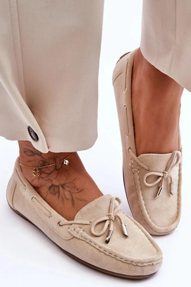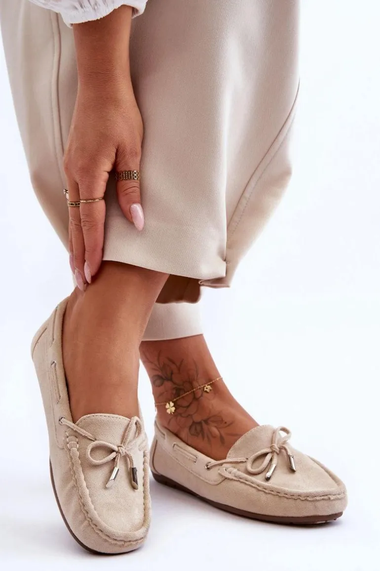 Damskie, klasyczne mokasyny zostały wykonane z eko zamszu. Model ten posiada na przodzie ozdobną kokardkę oraz przeplatające się przez boki cholewki sznureczki. Mokasyny osadzono na antypoślizgowej podeszwie. Miękka wkładka z eko skóry zapewni komfort podczas użytkowania obuwia. Dodatkowo jest delikatnie perforowana. Koniecznie powinnaś je mieć w swojej kolekcji obuwia! Przy wyborze rozmiaru prosimy sugerować się tabelą rozmiarów.