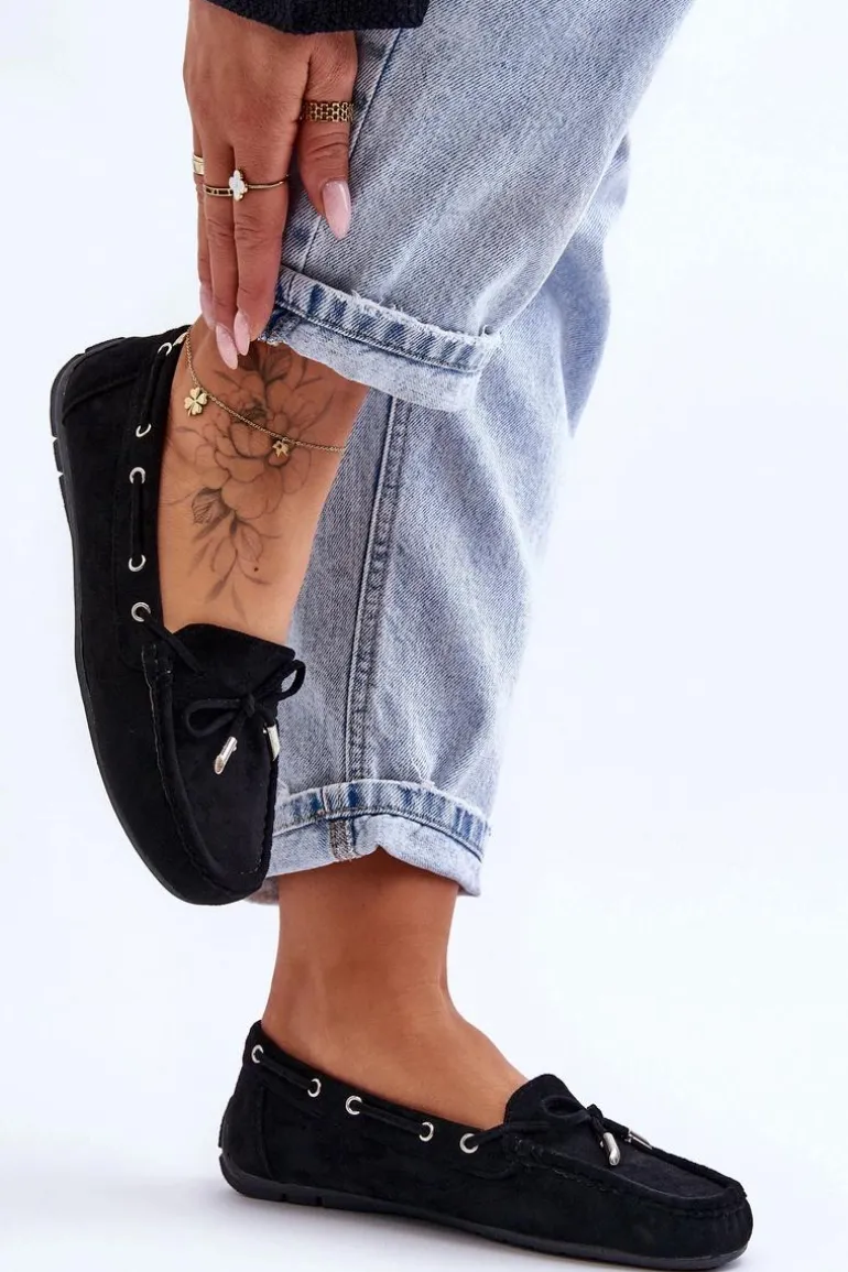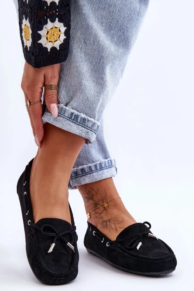 Damskie, klasyczne mokasyny zostały wykonane z eko zamszu. Model ten posiada na przodzie ozdobną kokardkę oraz przeplatające się przez boki cholewki sznureczki. Mokasyny osadzono na antypoślizgowej podeszwie. Miękka wkładka z eko skóry zapewni komfort podczas użytkowania obuwia. Dodatkowo jest delikatnie perforowana. Koniecznie powinnaś je mieć w swojej kolekcji obuwia! Przy wyborze rozmiaru prosimy sugerować się tabelą rozmiarów.