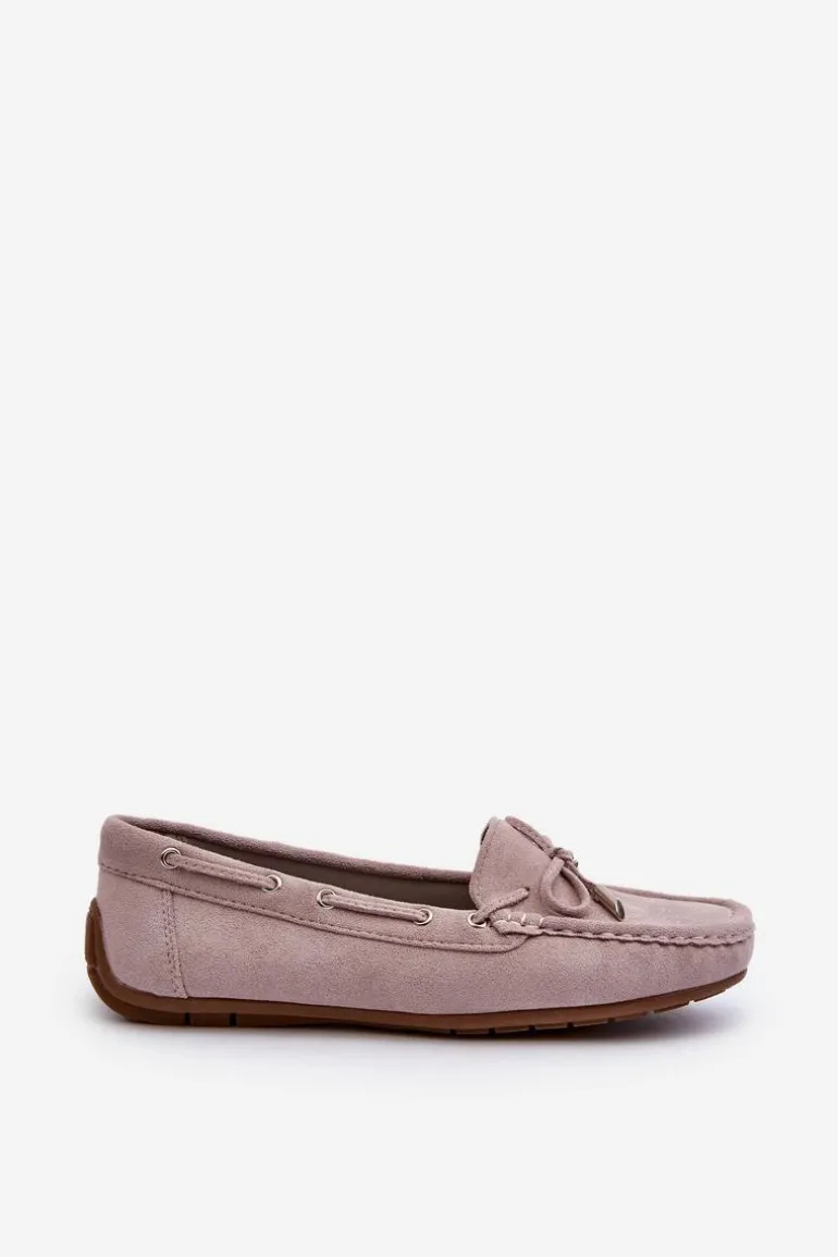 Damskie, klasyczne mokasyny zostały wykonane z eko zamszu. Model ten posiada na przodzie ozdobną kokardkę oraz przeplatające się przez boki cholewki sznureczki. Mokasyny osadzono na antypoślizgowej podeszwie. Miękka wkładka z eko skóry zapewni komfort podczas użytkowania obuwia. Dodatkowo jest delikatnie perforowana. Koniecznie powinnaś je mieć w swojej kolekcji obuwia! Przy wyborze rozmiaru prosimy sugerować się tabelą rozmiarów.