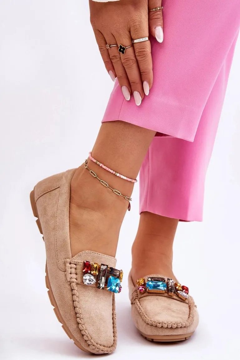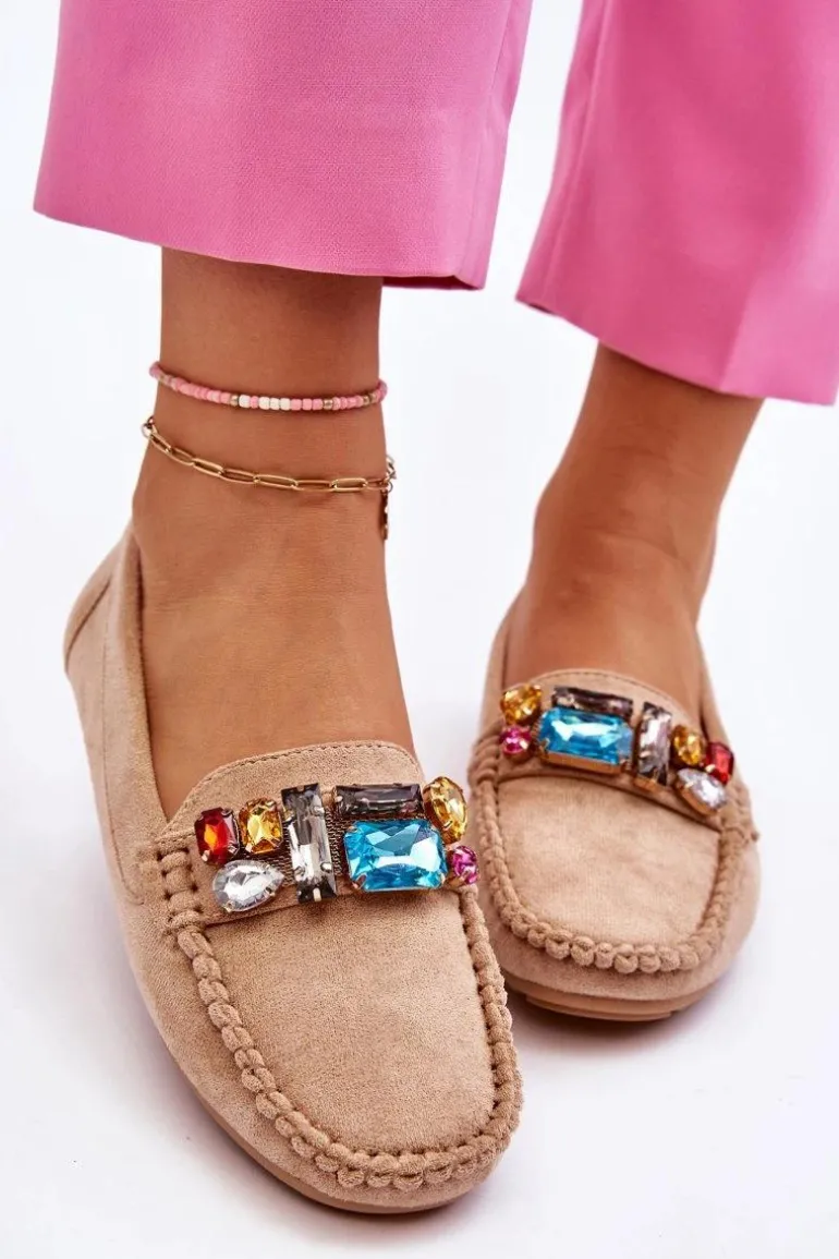 Klasyczne, damskie mokasyny zostały wykonane z eko zamszu. Na przodzie znajdują się ozdobne, kolorowe kryształki. Mokasyny zostały osadzone na podeszwie z delikatnym bieżnikiem. Miękka wkładka jest dodatkowo perforowana i wykonana z naturalnej skóry. Świetny model do wielu wiosenno-letnich stylizacji! Przy wyborze rozmiaru prosimy sugerować się tabelą rozmiarów.