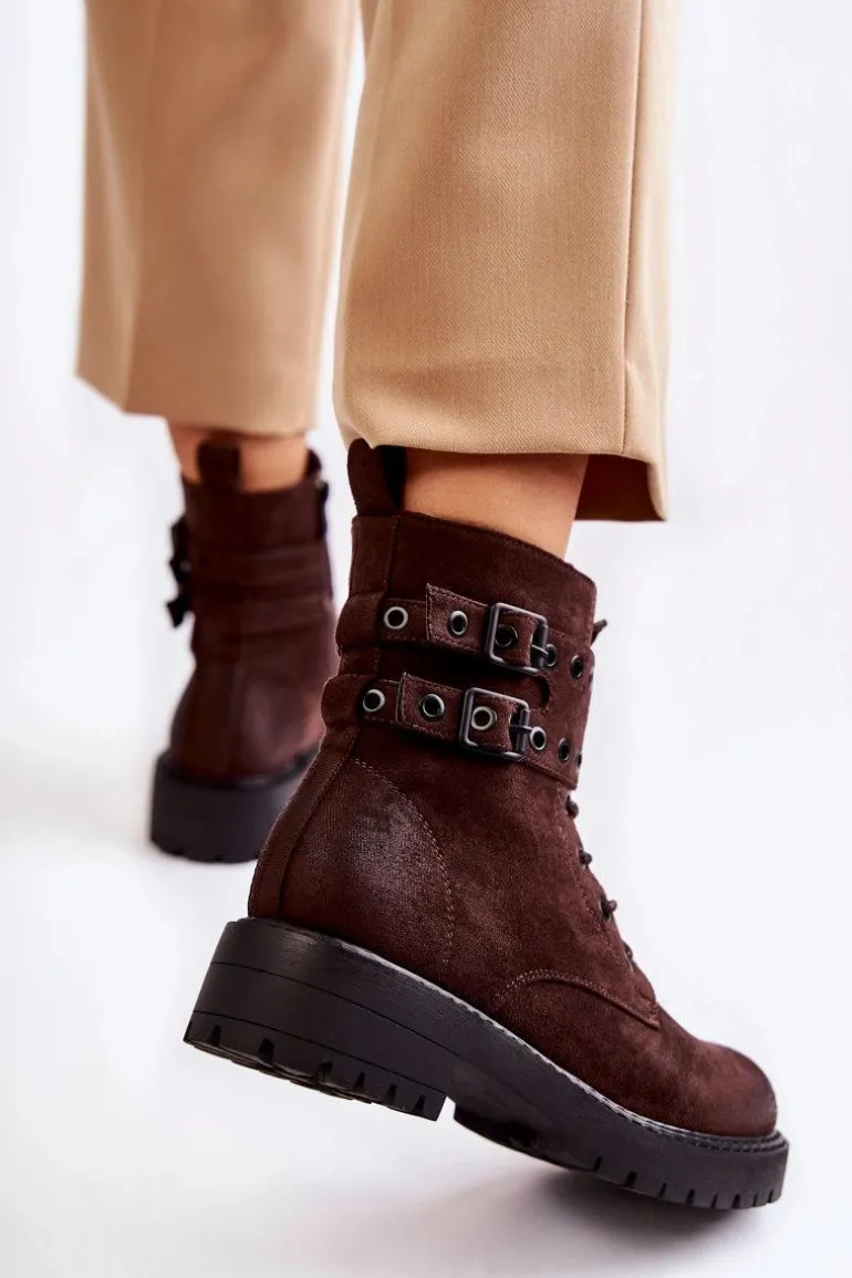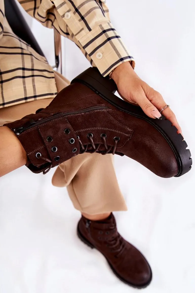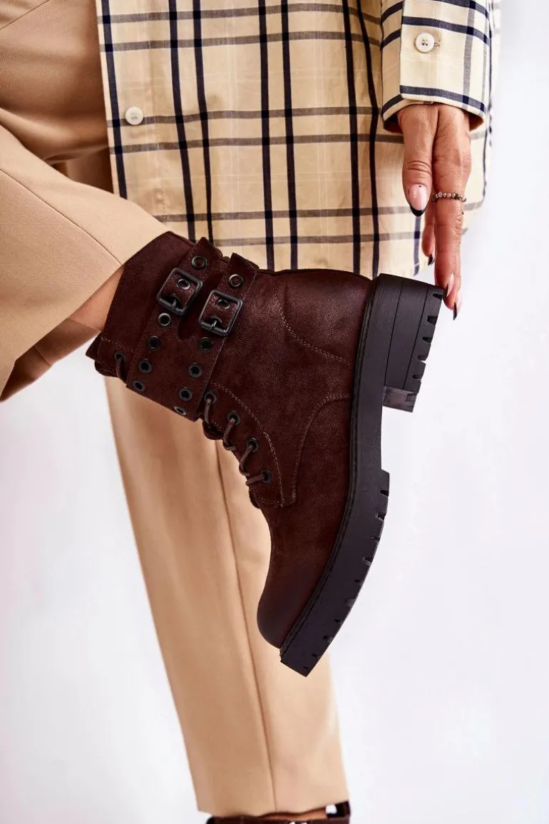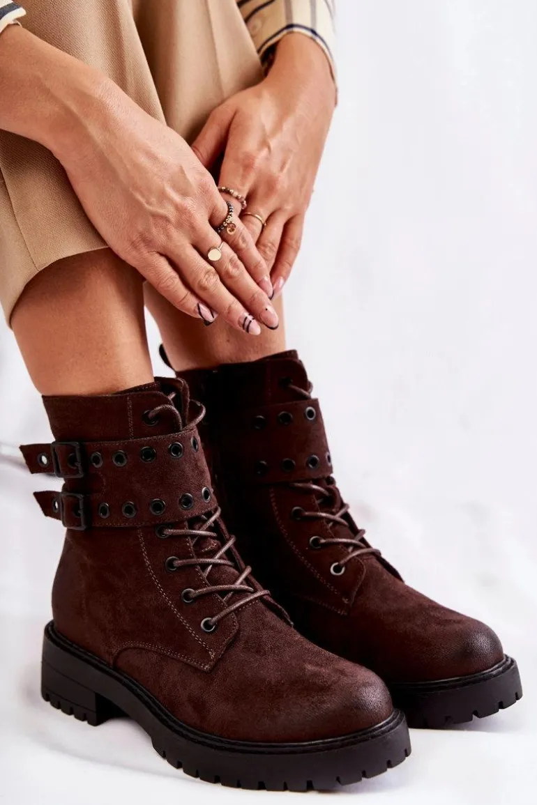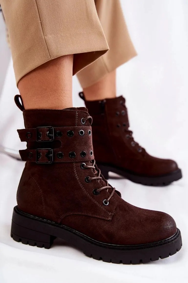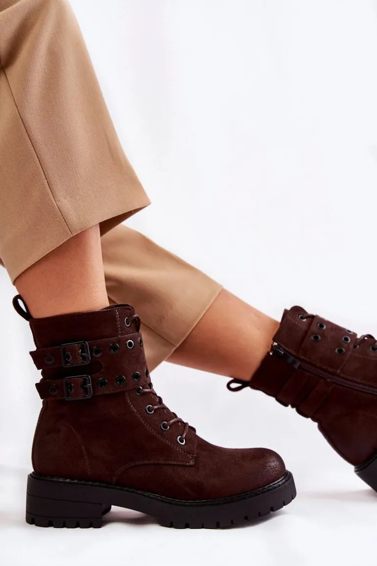 Wyjątkowe botki damskie zostały wykonane z eko zamszu z przecieranym noskiem i piętą. Posiadają suwak na boku cholewki, sznurowanie oraz modne klamry. W środku znajduje się ocieplenie w postaci koca obuwniczego. Buty dodatkowo posiadają usztywniany zapiętek. Świetny model na co dzień do pracy czy na spotkania z przyjaciółmi. Przy wyborze rozmiaru prosimy sugerować się tabelą rozmiarów.