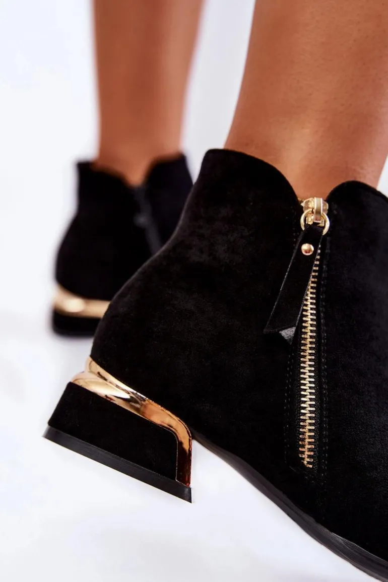 Botki damskie zostały wykonane z eko skórzanych materiałów. Posiadają nosek w szpic oraz ozdobny suwak po zewnętrznej stronie. Botki zostały ocieplone wewnątrz miłym w dotyku kocem obuwniczym. Osadzone na płaskim obcasie ozdobionym lustrzanym elementem. Zapiętek jest usztywniany. Zakładanie ułatwi wszyty suwak po wewnętrznej stronie. Przy wyborze rozmiaru prosimy sugerować się tabelą rozmiarów.