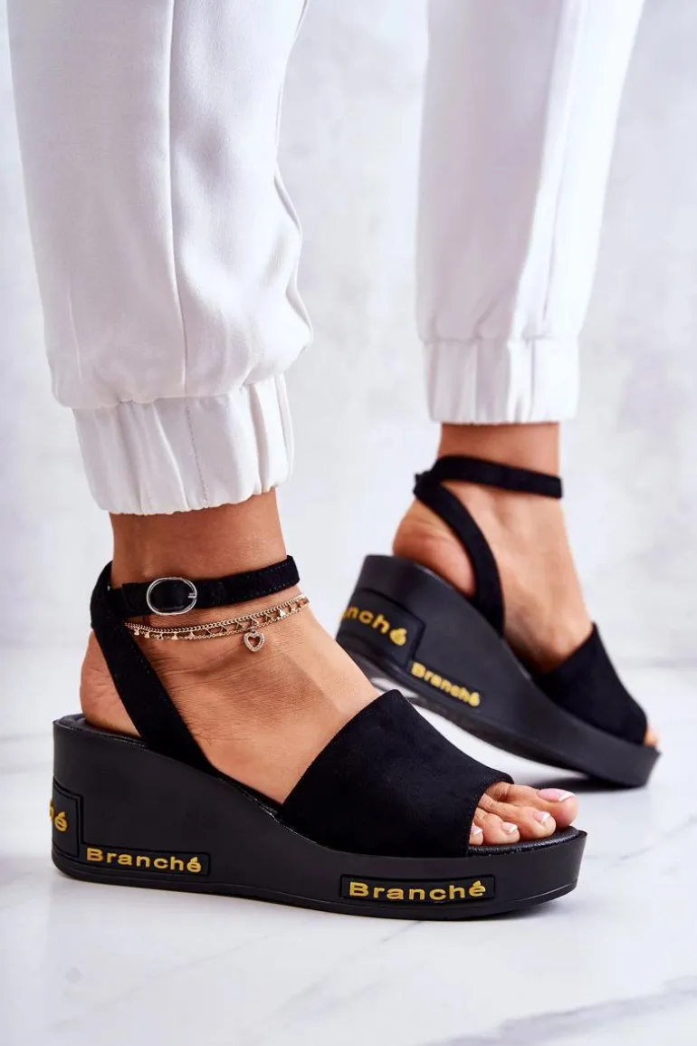 Modne sandały damskie osadzone na koturnie i delikatnej platformie. Wykonane z przyjemnego w dotyku eko zamszu. Pasek jest regulowany i zapinany na sprzączkę. Wkładka miękka i wykonana z eko skóry. Na platformie umieszczono napisy wykonane z gumowego tworzywa. Szerszy pasek na przodzie świetnie przytrzymuje stopę przed przesuwaniem się. Model idealny na lato, który powinnaś mieć w swojej garderobie! Przy wyborze rozmiaru prosimy sugerować się tabelą rozmiarów.