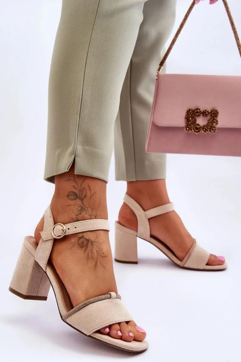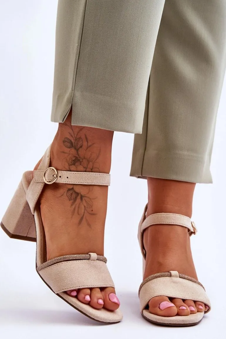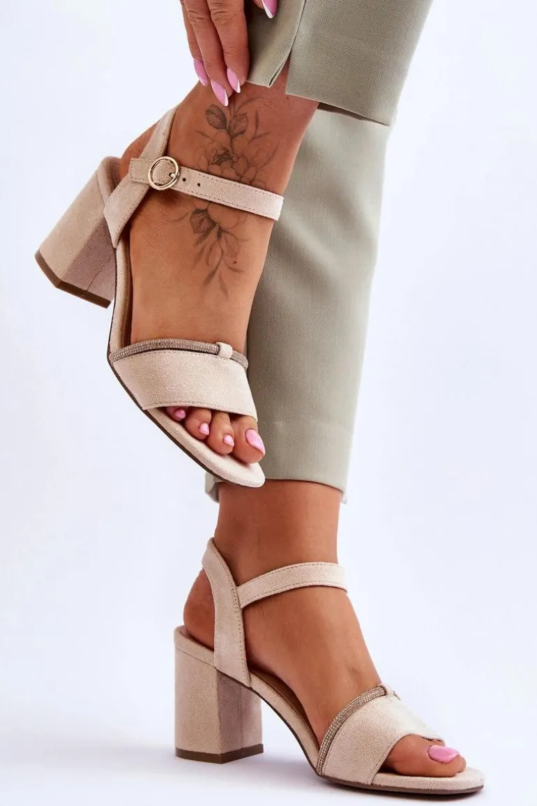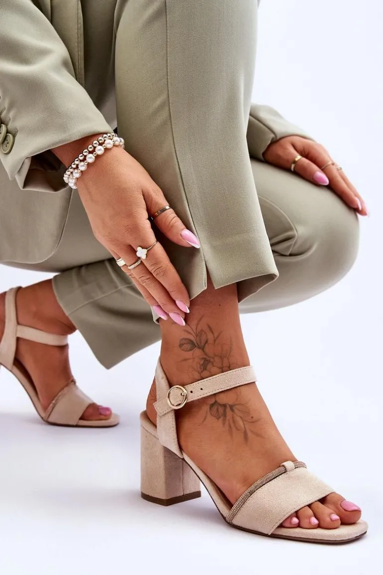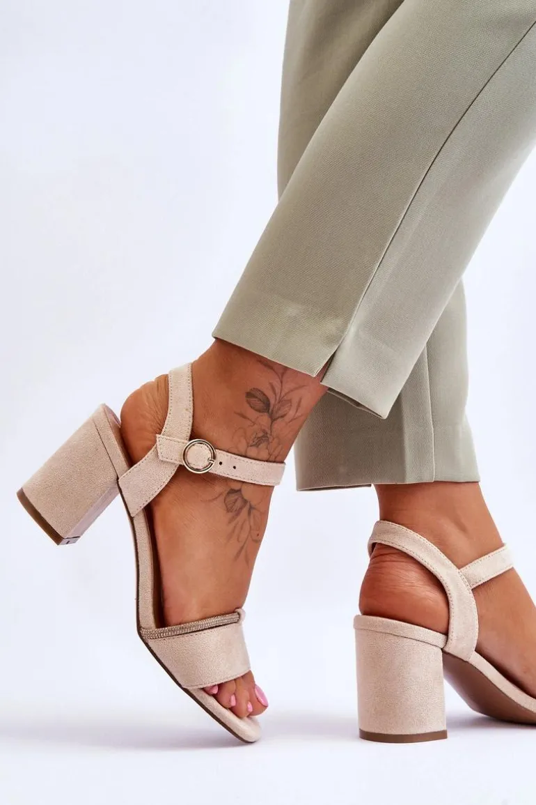 Damskie sandałki na obcasie w postaci słupka. Model ten został wykonany z miłego w dotyku eko zamszu. Sandałki zapinane na regulowany pasek ze sprzączką. Wkładka została wykonana z naturalnej skóry. Jest niezwykle miękka i wygodna w użytkowaniu. Koniecznie powinnaś je mieć! Przy wyborze rozmiaru prosimy sugerować się tabelą rozmiarów.