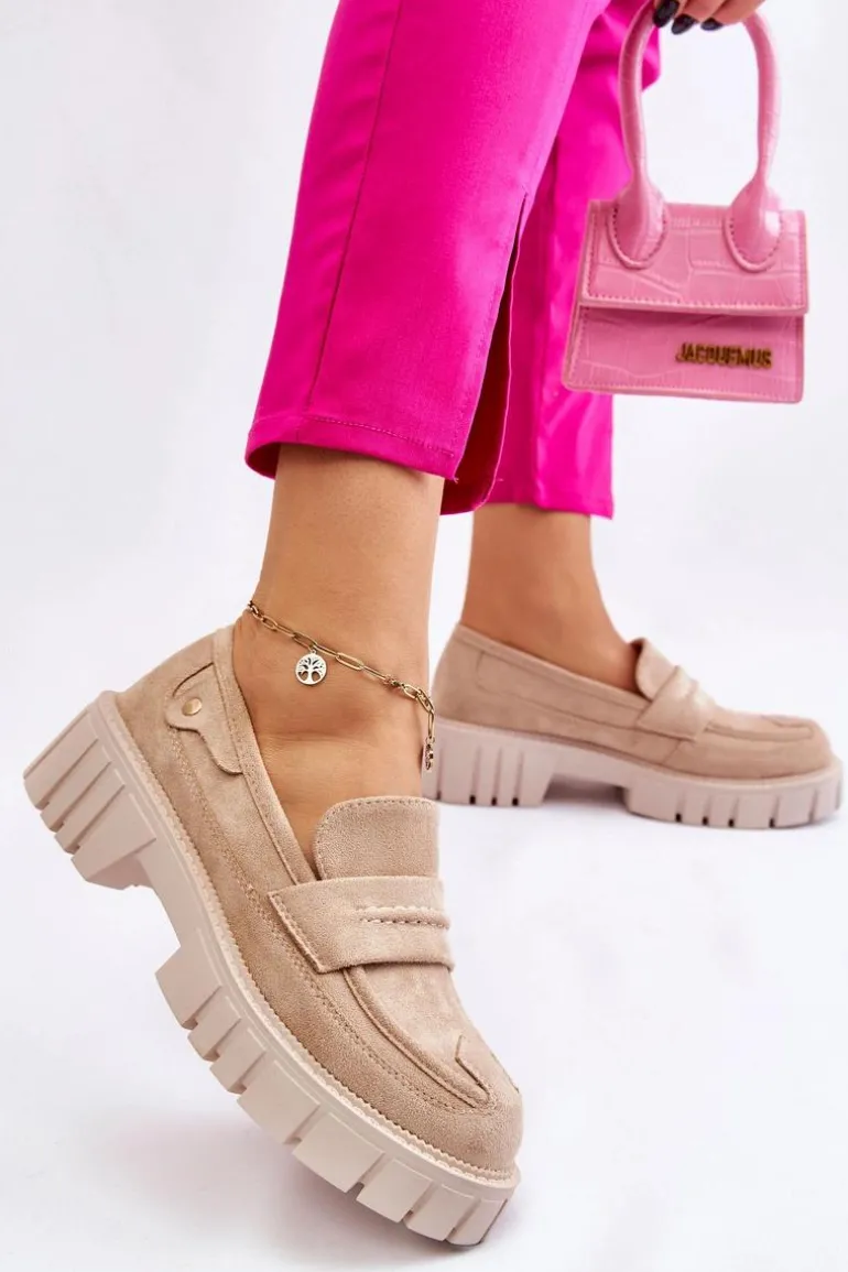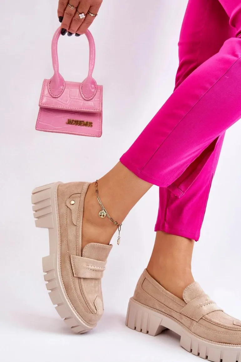 Świetne półbuty w stylu loaferów zostały wykonane z wysokiej jakości eko skóry z obszyciami. Charakterystyczne zdobienie w postaci paseczka na przodzie oraz nitu z boku cholewki. Posiadają masywną platformę oraz płaski obcas. Miękka wykonana z eko skóry wkładka zadba o komfort podczas użytkowania obuwia. Dodatkowo zapiętek jest usztywniany. Przy wyborze rozmiaru prosimy sugerować się tabelą rozmiarów.