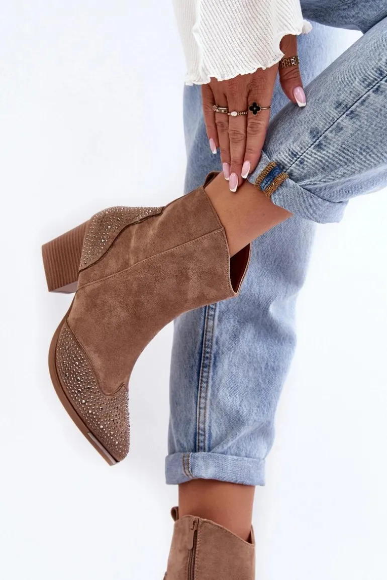 Botki w stylu kowbojek wykonane z eko zamszu. Osadzone na obcasie w postaci słupka. Noski w szpic optycznie wysmuklą nogi. Cholewka ozdobiona małymi dżetami. Środek ocieplony kocem obuwniczym. Model zapinany na suwak. Przy wyborze rozmiaru prosimy sugerować się tabelą rozmiarów.