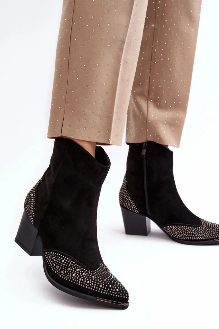 Botki w stylu kowbojek wykonane z eko zamszu. Osadzone na obcasie w postaci słupka. Noski w szpic optycznie wysmuklą nogi. Cholewka ozdobiona małymi dżetami. Środek ocieplony kocem obuwniczym. Model zapinany na suwak. Przy wyborze rozmiaru prosimy sugerować się tabelą rozmiarów.