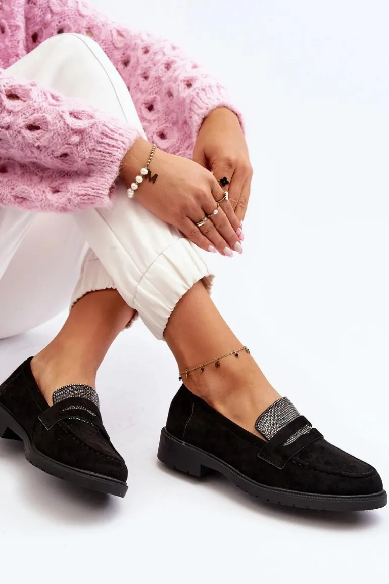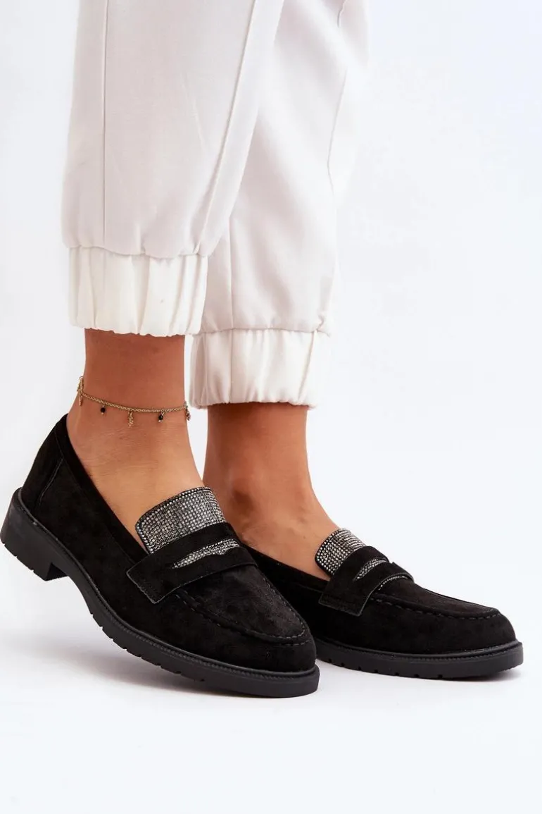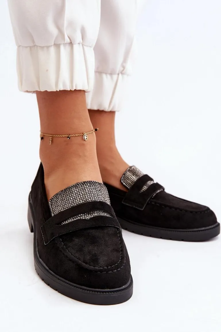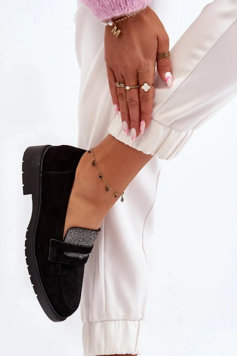 Damskie mokasyny zostały wykonane z miłego w dotyku eko zamszu. Osadzone na płaskim obcasie. Ozdobione małymi, błyszczącymi cyrkoniami. Miękka, eko skórzana wkładka zapewni wygodę użytkowania. Noski zaokrąglone. Ten stylowy fason dopasujesz do wielu stylizacji! Koniecznie powinnaś je mieć! Przy wyborze rozmiaru prosimy sugerować się tabelą rozmiarów.