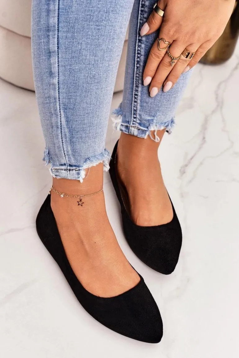 Delikatne baleriny z noskiem w szpic. Buty wykonane są z eko zamszu. Baleriny posiadają miękką wkładkę, która zapewni Ci komfort. Dostępne w wielu pięknych kolorach. Koniecznie sprawdź całą naszą kolekcję balerinek! Przy wyborze rozmiaru prosimy sugerować się tabelą rozmiarów.
