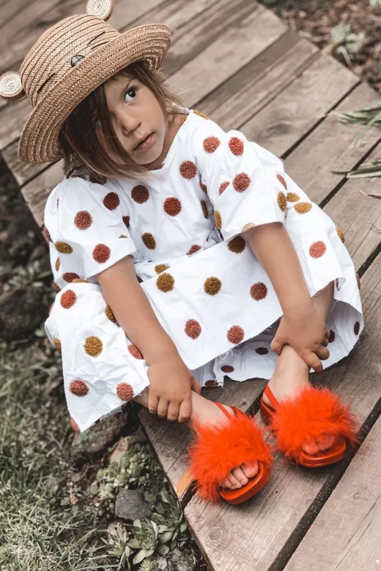 Klapki dziecięce ozdobione ekologicznym futerkiem. Klapki posiadają profilowaną, gumową wkładkę. Delikatny ściągacz zapewni dopasowanie do stopy oraz wygodę! Przy wyborze rozmiaru, prosimy sugerować się tabelą rozmiarów.