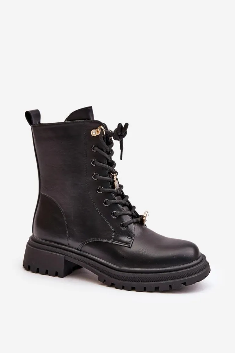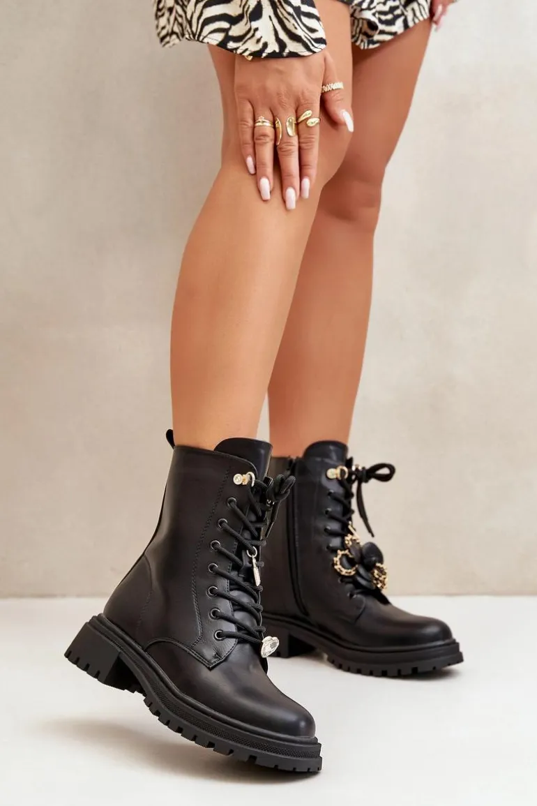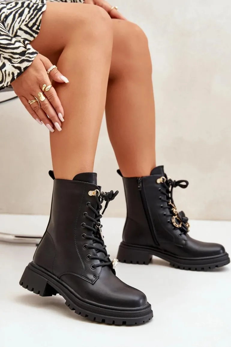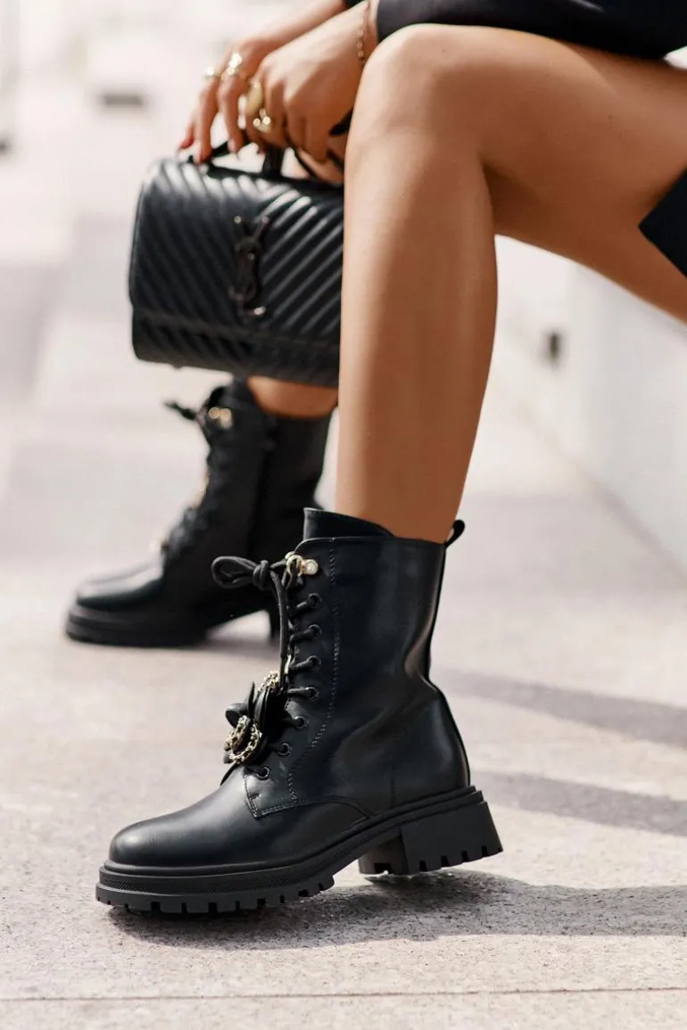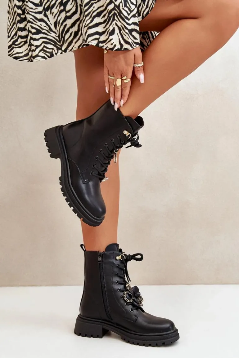 Damskie botki wykonane z ekologicznej skóry. Osadzone na płaskim obcasie. Noski zaokrąglone. Zapinane na suwak z boku dla łatwego zakładania, a dodatkowe sznurowanie z uroczymi przypinkami dodaje im wyjątkowego uroku. Idealne na jesienne i zimowe stylizacje, świetnie komponują się z różnymi zestawami na chłodniejsze dni. Przy wyborze rozmiaru prosimy sugerować się tabelą rozmiarów.
