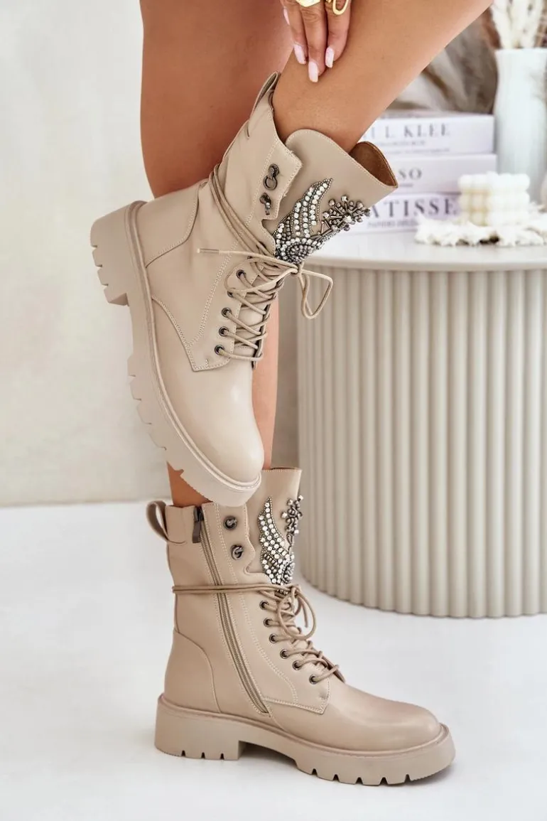 Ocieplane botki workery wykonane z eko skóry to stylowa i funkcjonalna propozycja na chłodniejsze dni. Osadzone na płaskim obcasie, zapewniają komfort noszenia, a dzięki zapięciu na zamek i sznurowaniu łatwo je dopasować do stopy. Zaokrąglone noski dodają klasycznego wyglądu, a zdobienie na języku wprowadza modny akcent. To idealny wybór dla osób ceniących wygodę i oryginalny design w codziennych stylizacjach. Przy wyborze rozmiaru prosimy sugerować się tabelą rozmiarów.