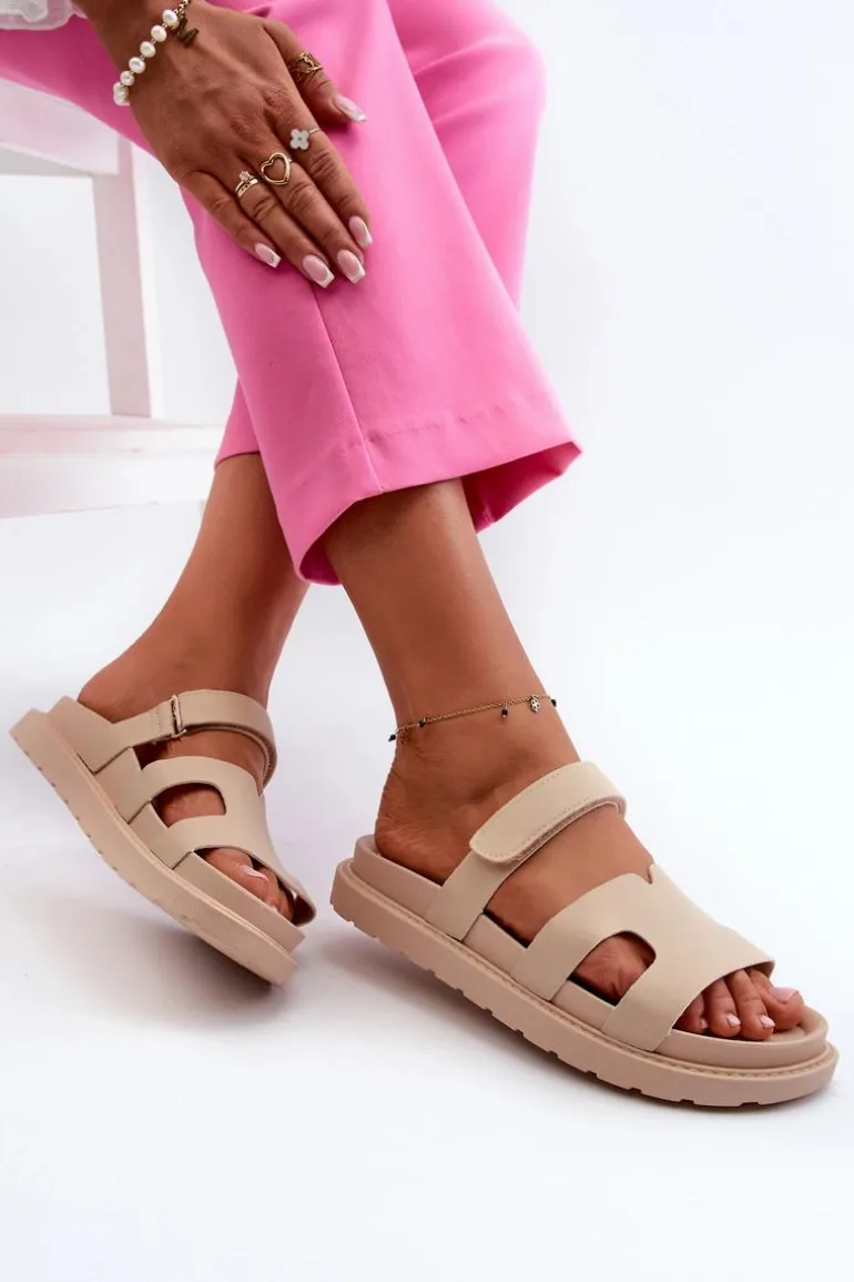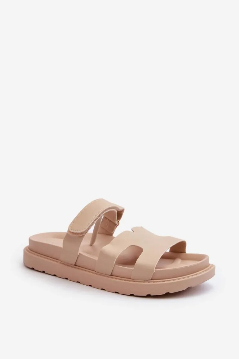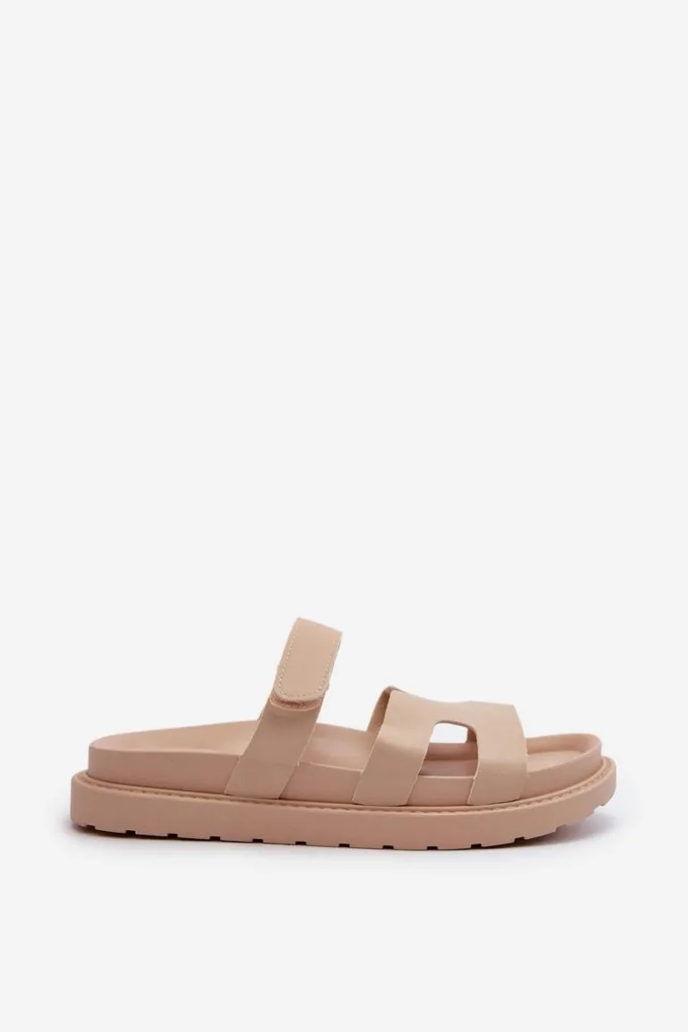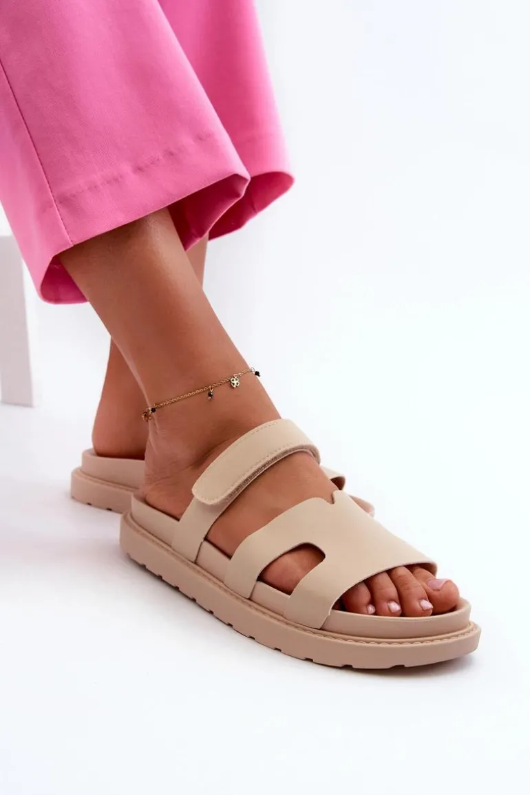 Eko Skórzane Klapki Damskie Na Rzep Jasnobeżowe Silaka