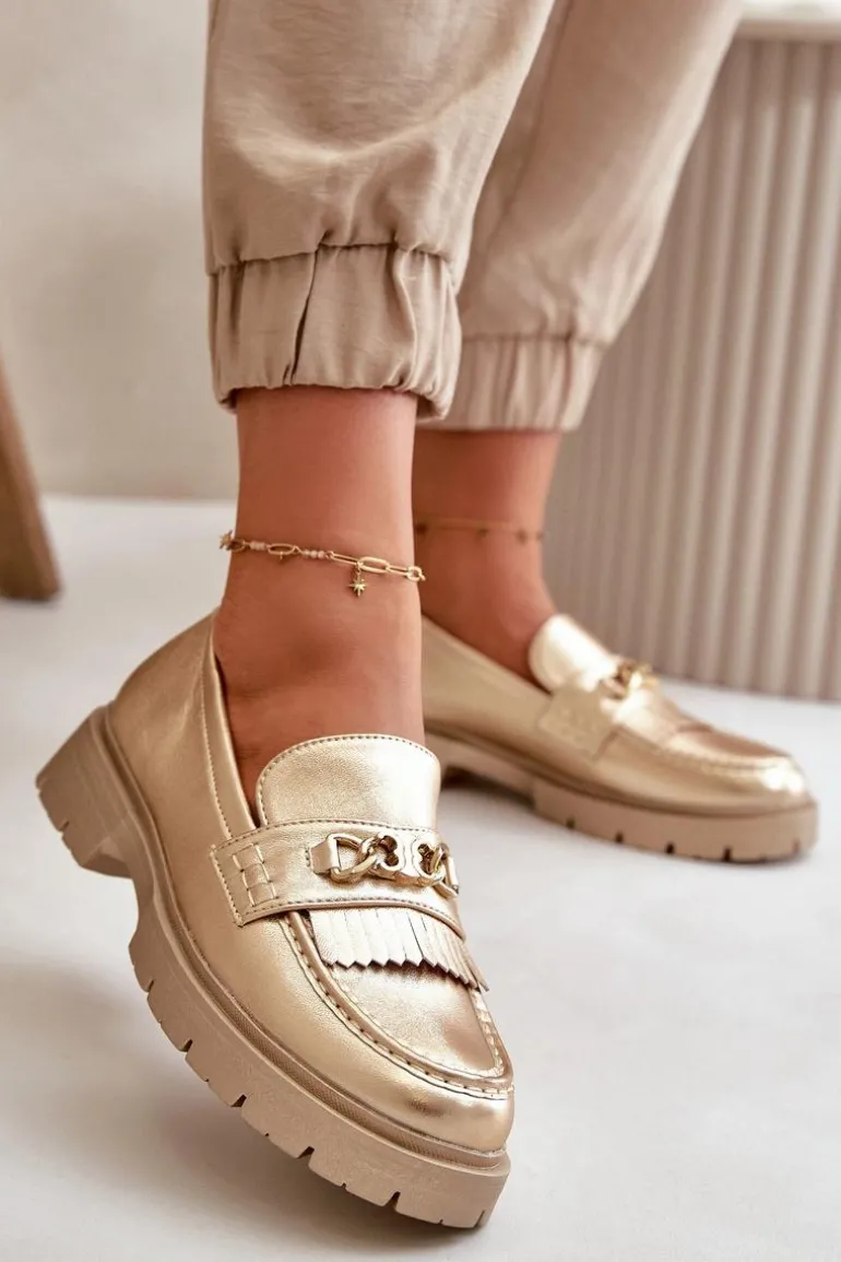 Mokasyny damskie w eleganckim stylu idealne na sezon wiosenno-jesienny. Wykonane ze skóry ekologicznej. Noski zaokrąglone. Przód zdobi złoty detal, który dodaje uroku. Osadzone na płaskim, stabilnym obcasie. Niezwykle modny fason idealnie dopełni wiele styliacji! Przy wyborze rozmiaru prosimy sugerować się tabelą rozmiarów.