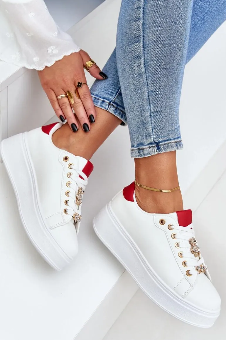 Damskie sneakersy z eko skóry. Osadzone na platformie, nie tylko dodają delikatnej wysokości, ale także gwarantują wygodę podczas noszenia. Zaokrąglone noski nadają im tradycyjnego wyglądu, a sznurowanie umożliwia doskonałe dopasowanie do stopy. Urocze przypinki na sznurowadłach stanowią wyjątkowy detal, wprowadzając oryginalność i dziewczęcy urok. Ten model doskonale sprawdzi się zarówno w codziennych, jak i bardziej swobodnych stylizacjach, stanowiąc stylowe uzupełnienie każdej szafy. Przy wyborze rozmiaru prosimy kierować tabelą rozmiarów.