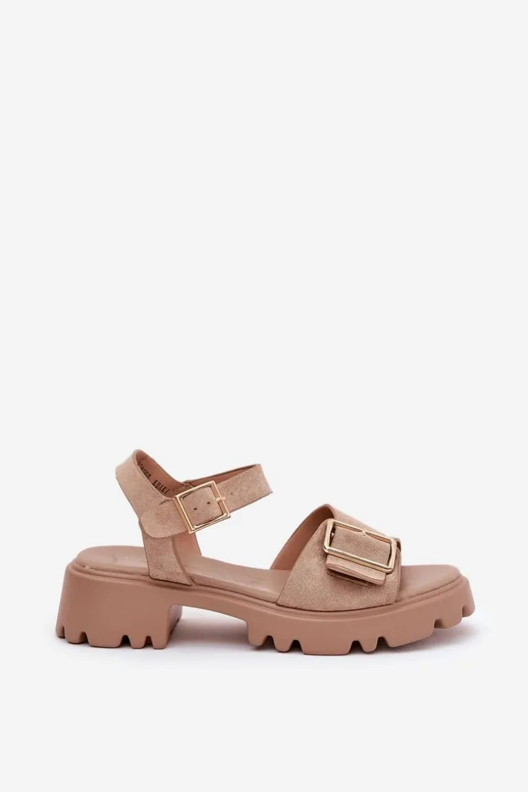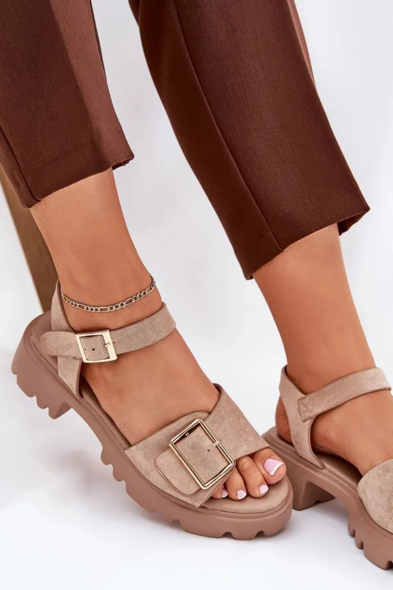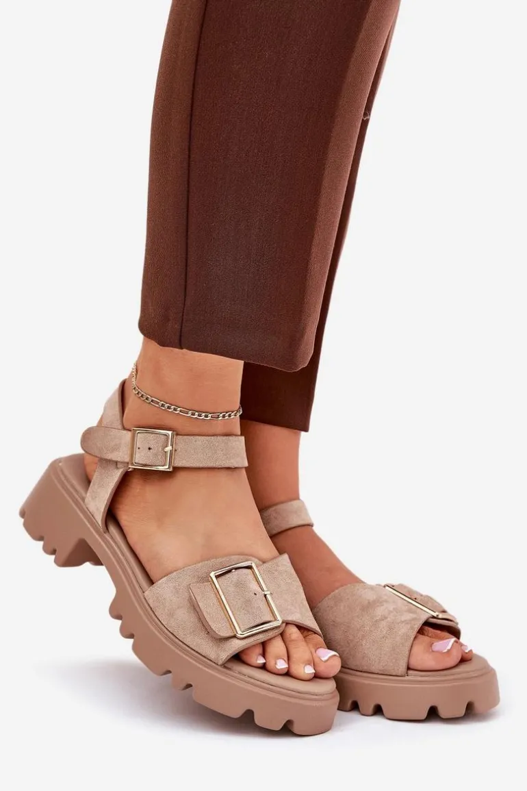 Eleganckie sandały damskie wykonane z eko zamszu, osadzone na platformie oraz płaskim obcasie, które zapewniają wygodę i stabilność. Z przodu buty ozdobione zostały dużą złotą klamrą, która dodaje im subtelnej elegancji i charakteru. Zapinane na regulowany pasek ze sprzączką, co pozwala na idealne dopasowanie do stopy. Te sandały to doskonały wybór na ciepłe dni, pasujące zarówno do sukienek, jak i spodni, łącząc styl i komfort w każdej stylizacji. Przy wyborze rozmiaru prosimy sugerować się tabelą rozmiarów.