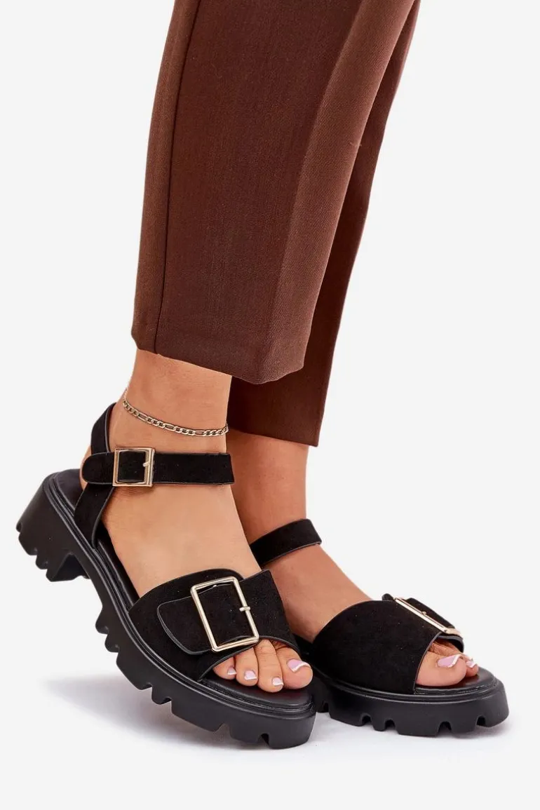 Eleganckie sandały damskie wykonane z eko zamszu, osadzone na platformie oraz płaskim obcasie, które zapewniają wygodę i stabilność. Z przodu buty ozdobione zostały dużą złotą klamrą, która dodaje im subtelnej elegancji i charakteru. Zapinane na regulowany pasek ze sprzączką, co pozwala na idealne dopasowanie do stopy. Te sandały to doskonały wybór na ciepłe dni, pasujące zarówno do sukienek, jak i spodni, łącząc styl i komfort w każdej stylizacji. Przy wyborze rozmiaru prosimy sugerować się tabelą rozmiarów.