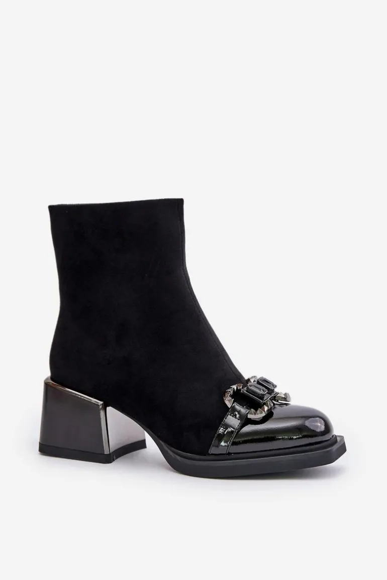 Botki damskie wykonane z wysokiej jakości eko zamszu. Osadzone na masywnym obcasie w postaci klocka, co zapewni stabilność na każdym kroku. Z przodu ozdoba, która nadaje wyjątkowego uroku. Zapinane na zamek. Środek ocieplony kocem obuwniczym. Ten elegancki fason z pewnością dopełni wiele jesienno-zimowych styliazcji! Przy wyborze rozmiaru prosimy sugerować się tabelą rozmiarów.