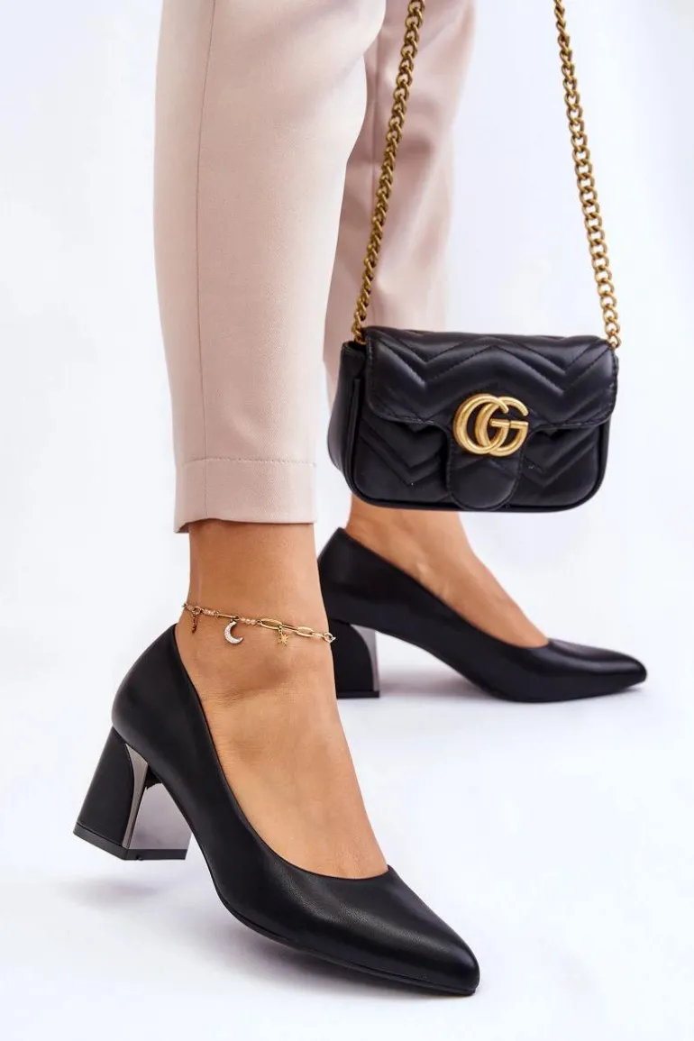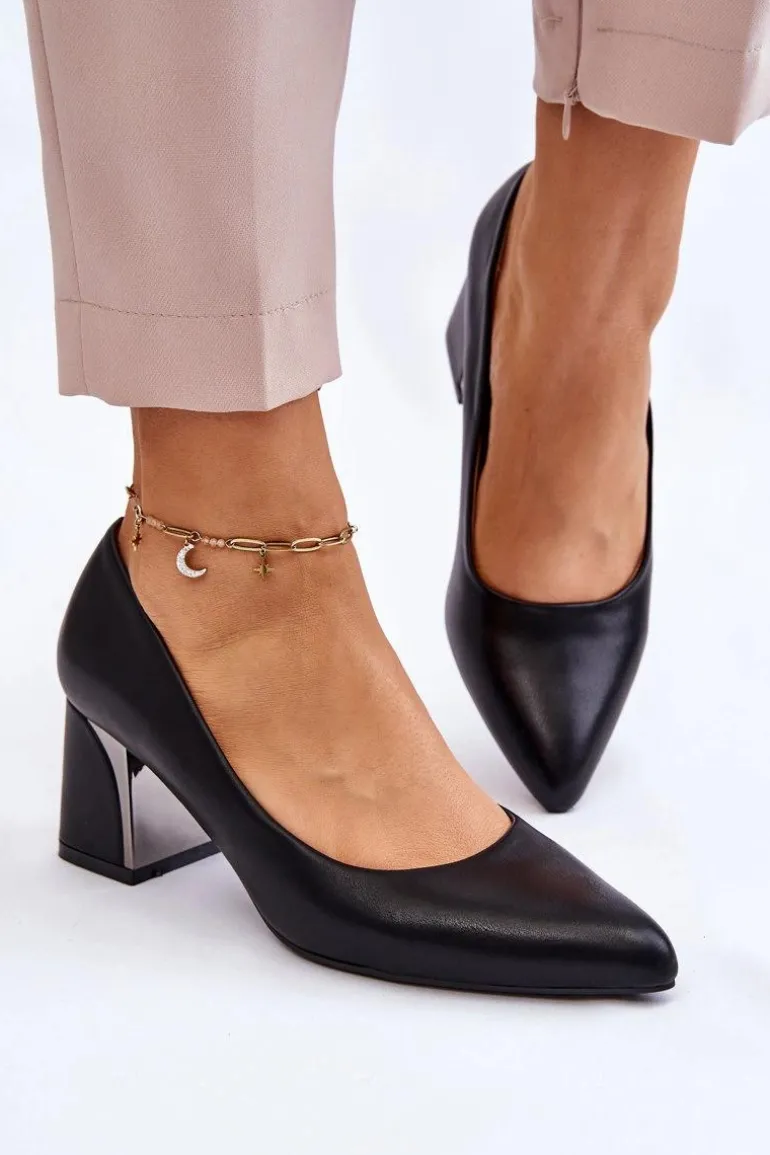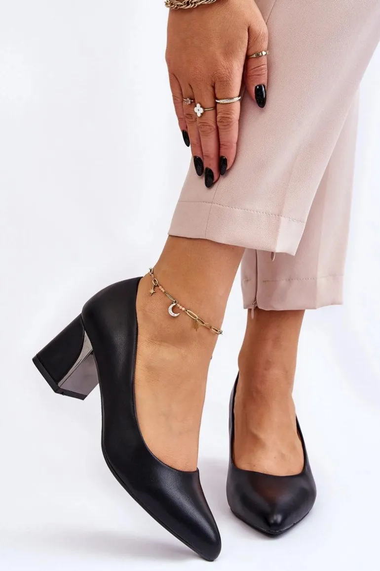 Te piękne czółenka zostały osadzone na obcasie w postaci stabilnego słupka ozdobionego lustrzanym elementem. Miękka wkładka zapewni komfortowe użytkowanie. Cholewka została wykonana ze skóry ekologicznej. Charakterystyczny nosek w szpic. Idealny model do pracy, na randkę czy biznesowe spotkania. Koniecznie musisz je mieć! Przy wyborze rozmiaru prosimy sugerować się tabelą rozmiarów.