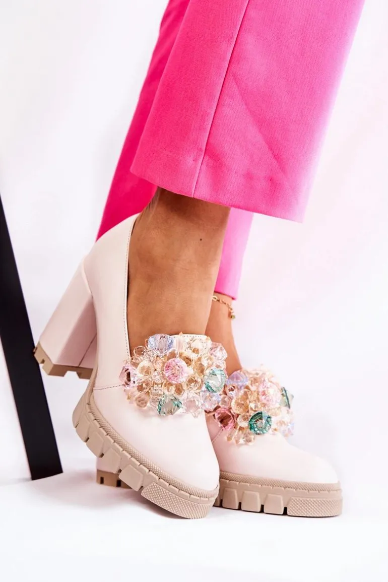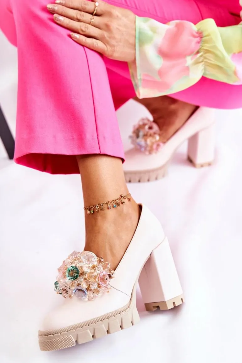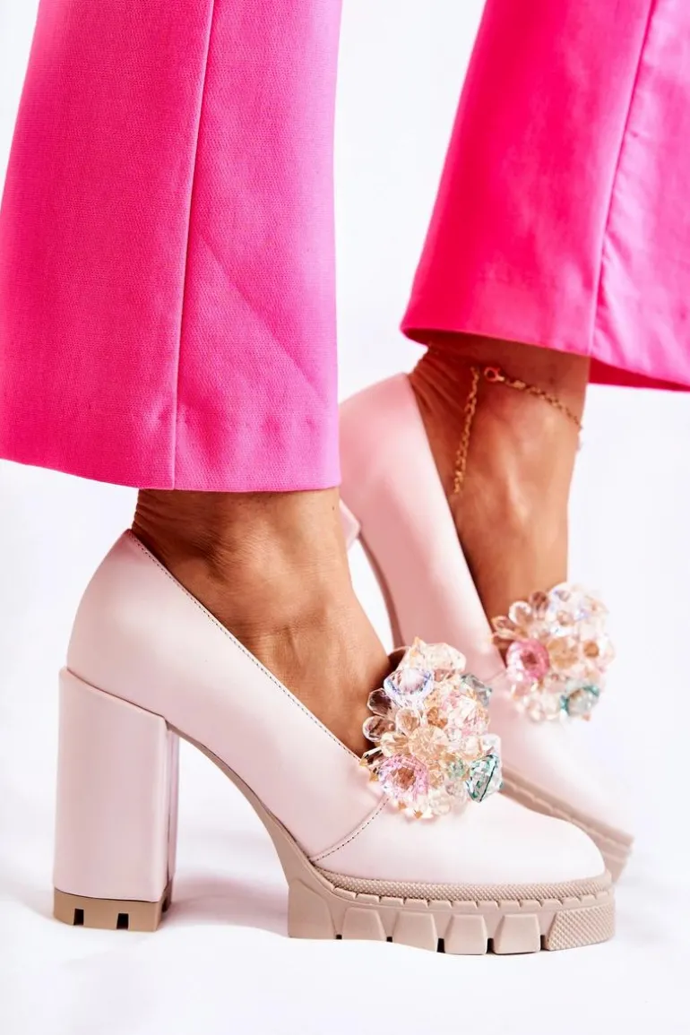 Cudne czółenka na masywnym obcasie w postaci słupka oraz platformie. Traperowa podeszwa sprawia, że te buty są wygodne i stabilne podczas użytkowania. Posiadają ozdobę w postaci imitacji barwnych kryształków z przodu obuwia. Miękka wkładka została wykonana z naturalnej skóry. Komfort to podstawa! Modny fason zachwyci niejedną miłośniczkę wysokich obcasów! Koniecznie powinnaś mieć ten model w swojej kolekcji obuwia! Przy wyborze rozmiaru prosimy sugerować się tabelą rozmiarów.