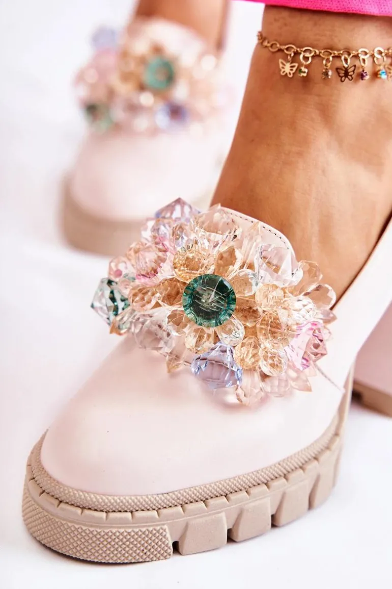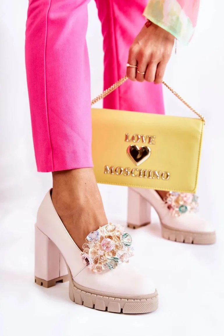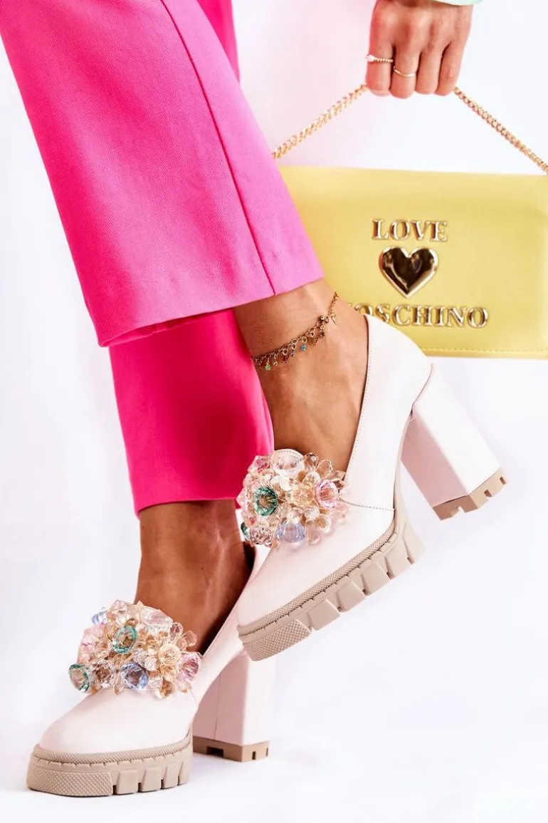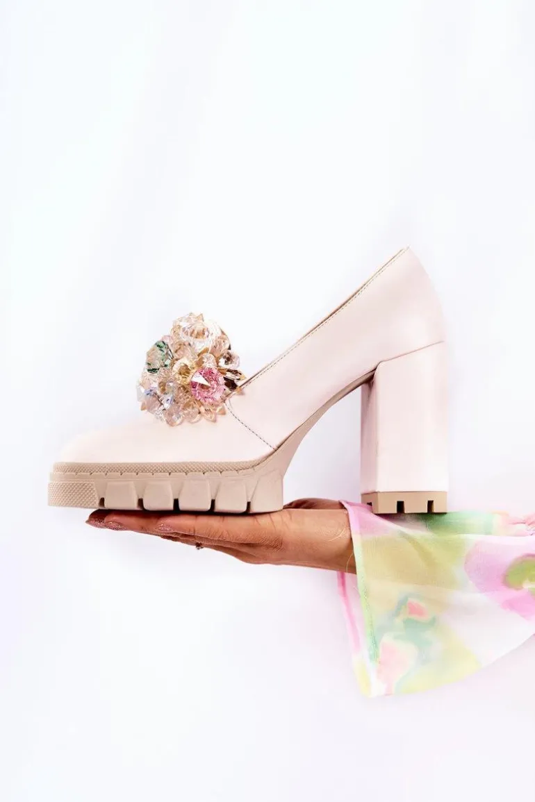 Cudne czółenka na masywnym obcasie w postaci słupka oraz platformie. Traperowa podeszwa sprawia, że te buty są wygodne i stabilne podczas użytkowania. Posiadają ozdobę w postaci imitacji barwnych kryształków z przodu obuwia. Miękka wkładka została wykonana z naturalnej skóry. Komfort to podstawa! Modny fason zachwyci niejedną miłośniczkę wysokich obcasów! Koniecznie powinnaś mieć ten model w swojej kolekcji obuwia! Przy wyborze rozmiaru prosimy sugerować się tabelą rozmiarów.