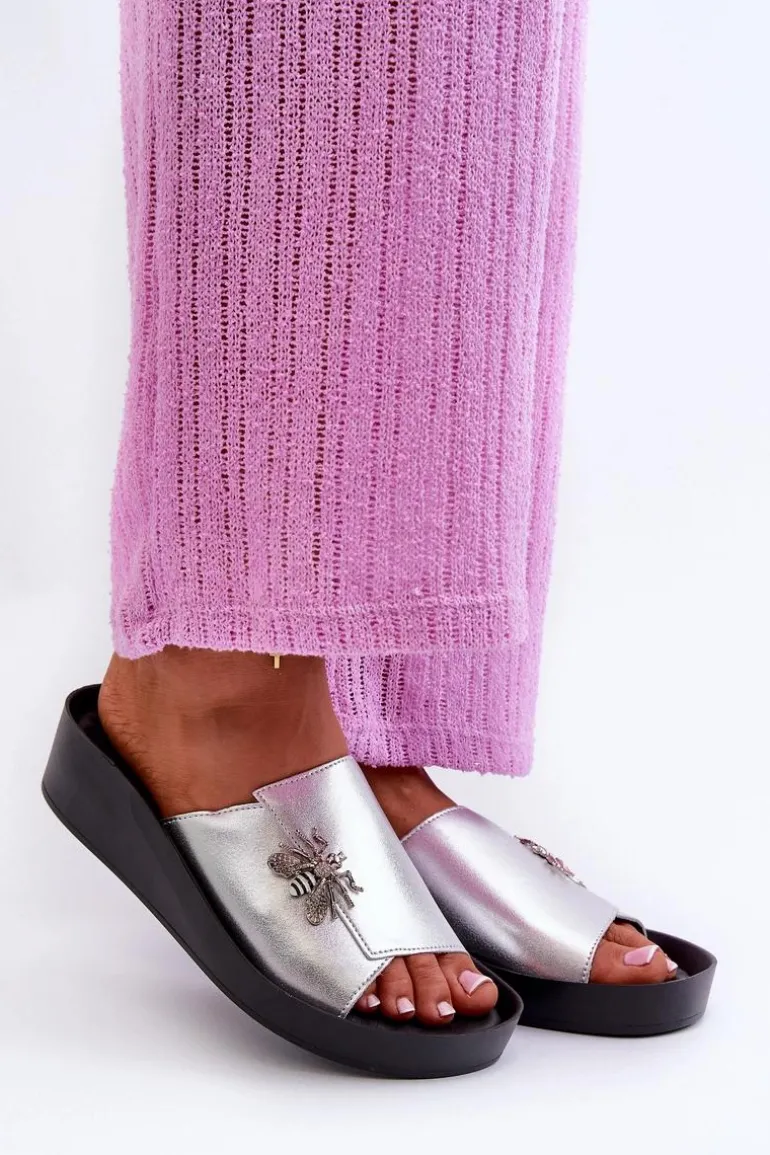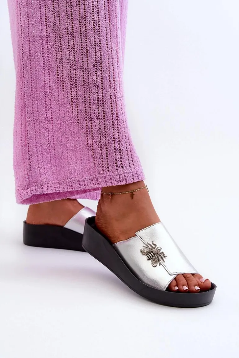 Eleganckie Klapki Damskie Z Ozdobą Skóra Naturalna S.Barski KV27-015 Srebrne