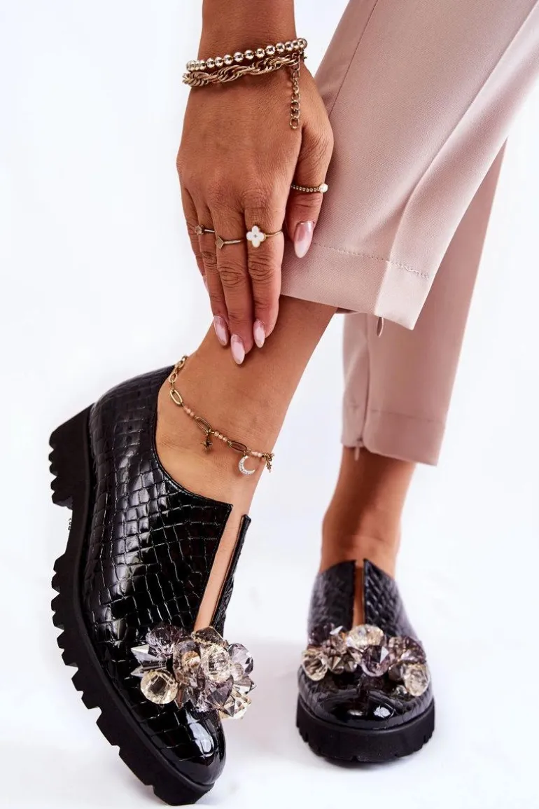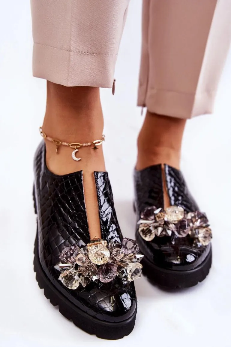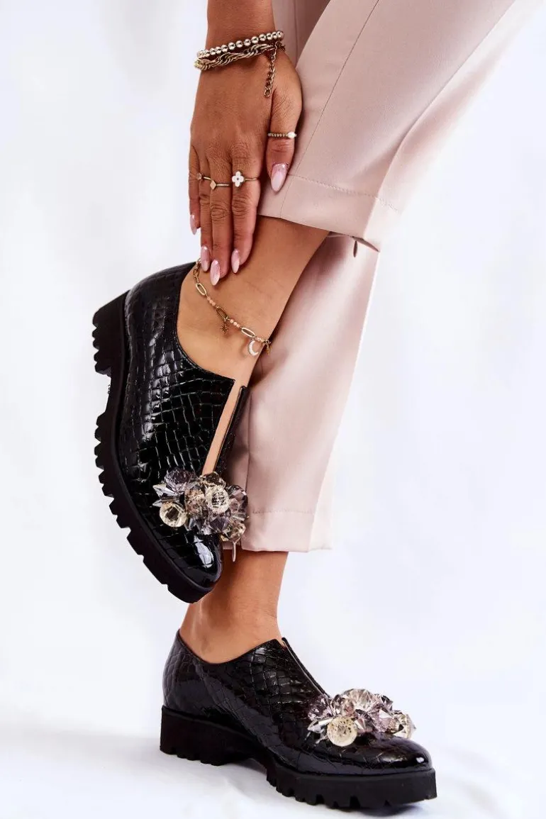 Eleganckie Lakierowane Półbuty Z Ozdobą Krokodyl Czarne Cindy