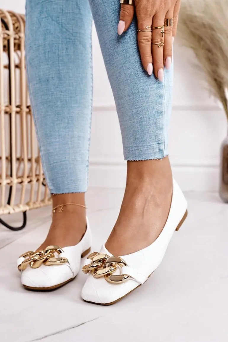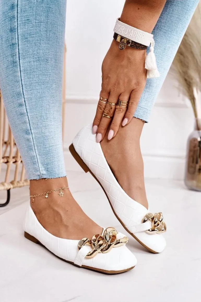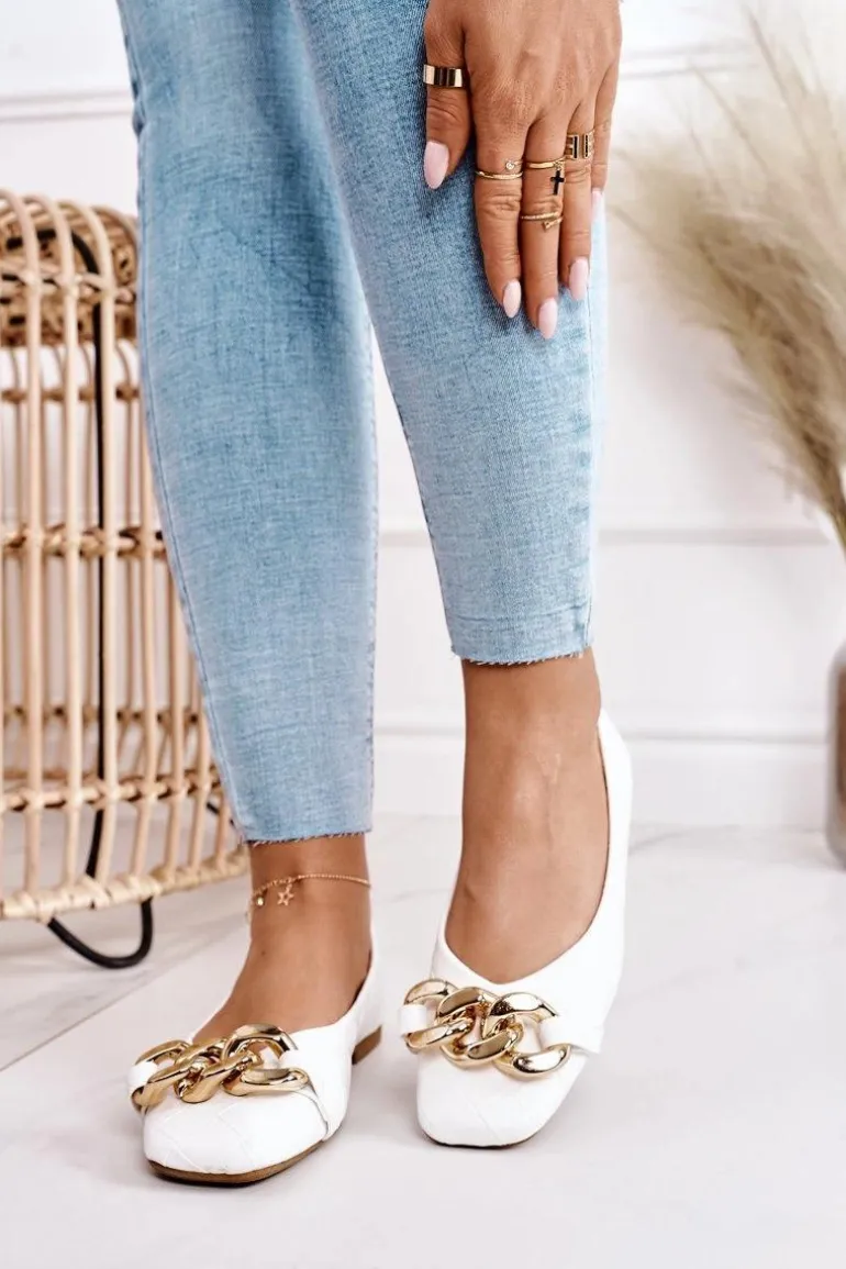 Eleganckie Pikowane Baleriny Z Łańcuchem Białe Coco