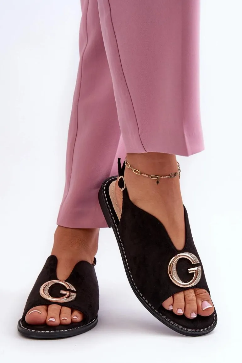 Eleganckie sandały damskie marki S.Barski. Wykonane z eko zamszu. Osadzone na płaskim obcasie. Z przodu złota ozdoba. Zapinanie na regulowany pasek ze sprzączką gwarantuje idealne dopasowanie do stopy. Miękka wkładka ze skóry naturalnej zapewni komfort na każdym kroku. Model ten z pewnością dopełni wiele stylizacji! Przy wyborze rozmiaru prosimy kierować się tabelą rozmiarów.