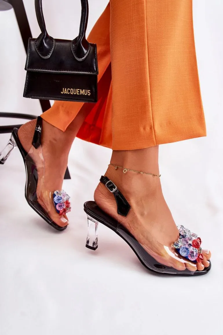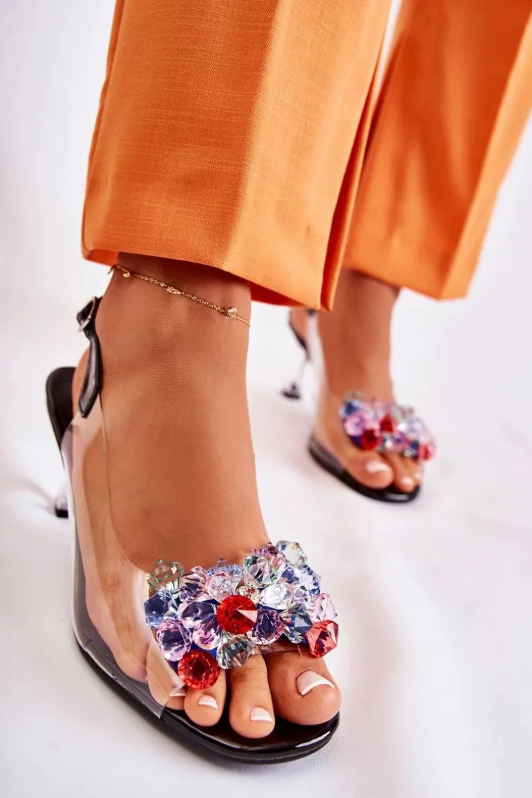 Piękne sandały na obcasie w postaci przezroczystego, cienkiego słupka. Posiadają ozdobę w postaci imitacji kryształków z przodu. Miękka i profilowana wkładka została wykonana z naturalnej skóry. Komfort to podstawa! Modny fason zachwyci niejedną miłośniczkę wysokich obcasów! Zapinane na klamrę z regulowanym paskiem. Koniecznie powinnaś mieć ten model w swojej kolekcji obuwia! Przy wyborze rozmiaru prosimy sugerować się tabelą rozmiarów.