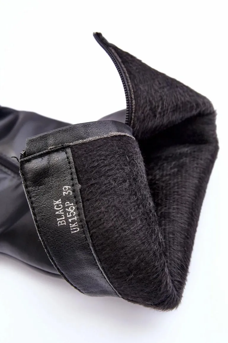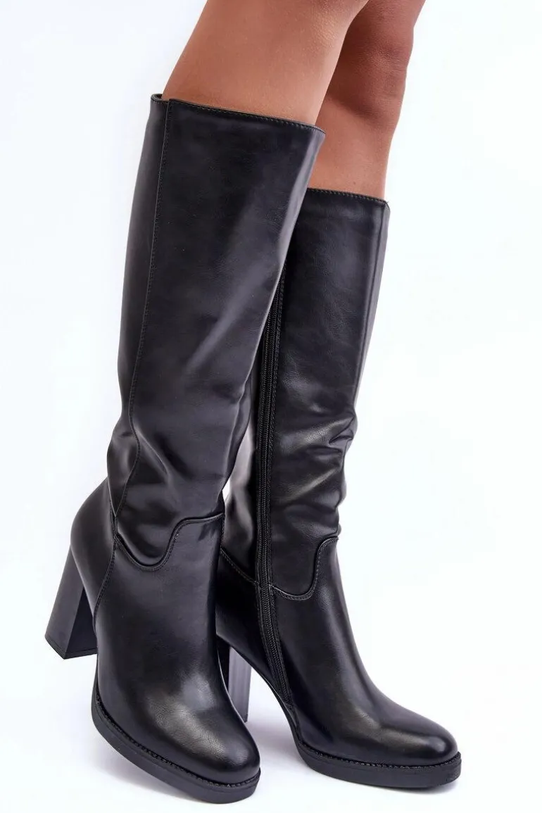 Eleganckie kozaki damskie z cholewką przed kolano. Wykonane z eko skóry. Osadzone na obcasie w postaci słupka. Zapinane na suwak po wewnętrznej stronie cholewki. Środek ocieplony kocem obuwniczym. Zapiętek w tym obuwiu jest usztywniony. Wykorzystasz je w wielu stylizacjach! Przy wyborze rozmiaru prosimy sugerować się tabelą rozmiarów.