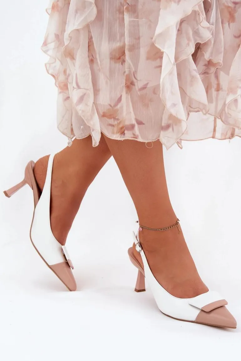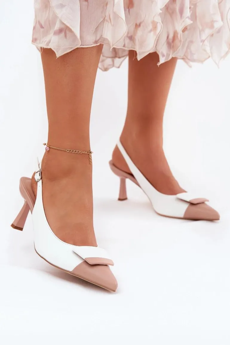 Eleganckie szpilki damskie wykonane z eko skóry. Odkryte pięty i szpiczaste noski nadają im subtelnej elegancji. Z przodu buty posiadają ozdobny detal, który dodaje im wyjątkowego charakteru. Idealne na wieczorne wyjścia, te szpilki będą doskonałym wyborem do eleganckich sukienek i koktajlowych stylizacji. Przy wyborze rozmiaru prosimy sugerować się tabelą rozmiarów.