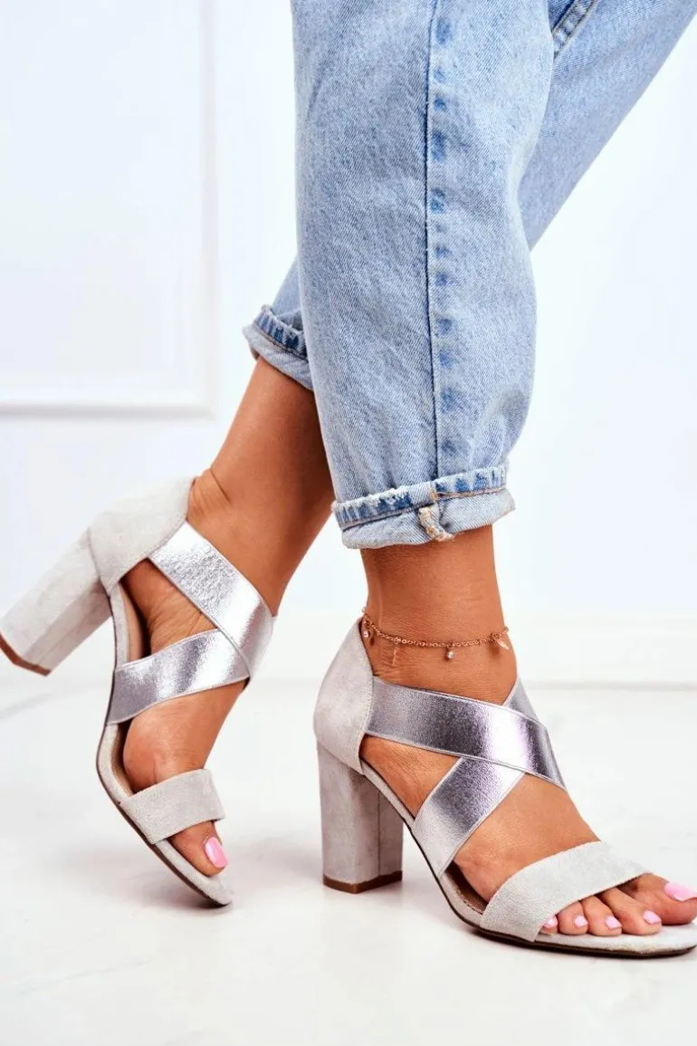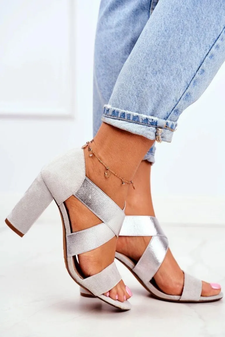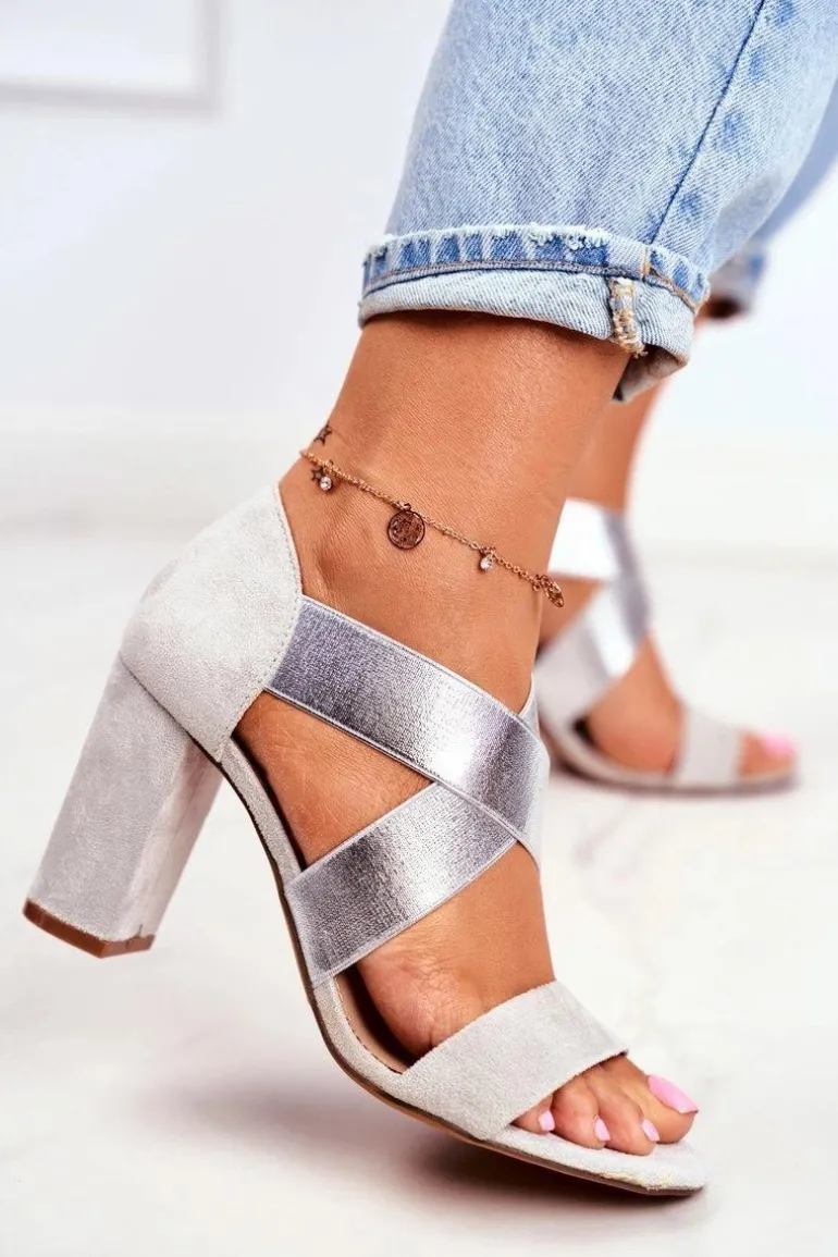 Eleganckie Wsuwane Sandały Na Słupku Szaro-Srebrne Varina